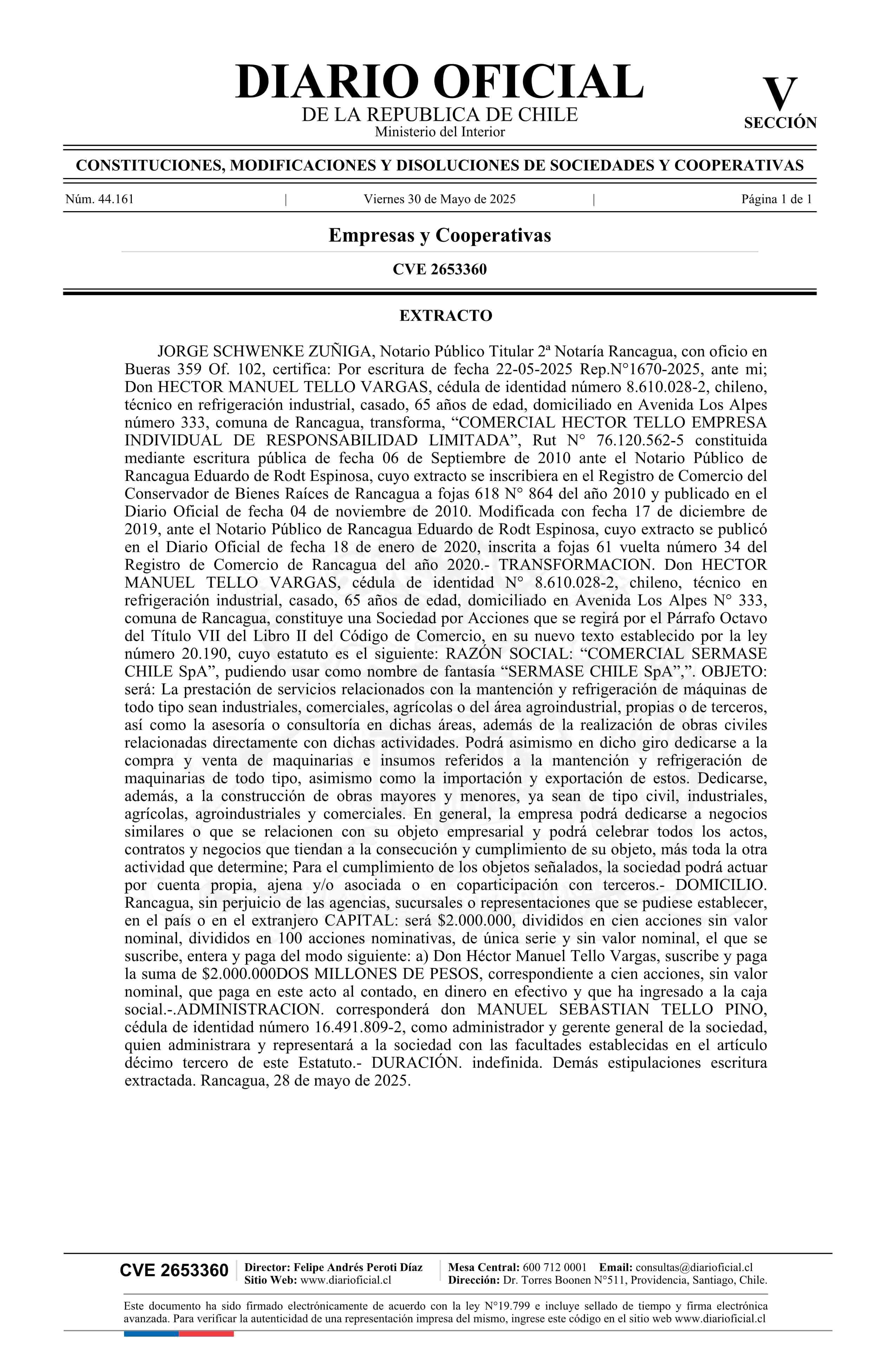 COMERCIAL HECTOR TELLO EMPRESA INDIVIDUAL DE RESPONSABILIDAD LIMITADA 76.120.562-5* 30-05-2025 Diario Oficial Edición Electrónica |