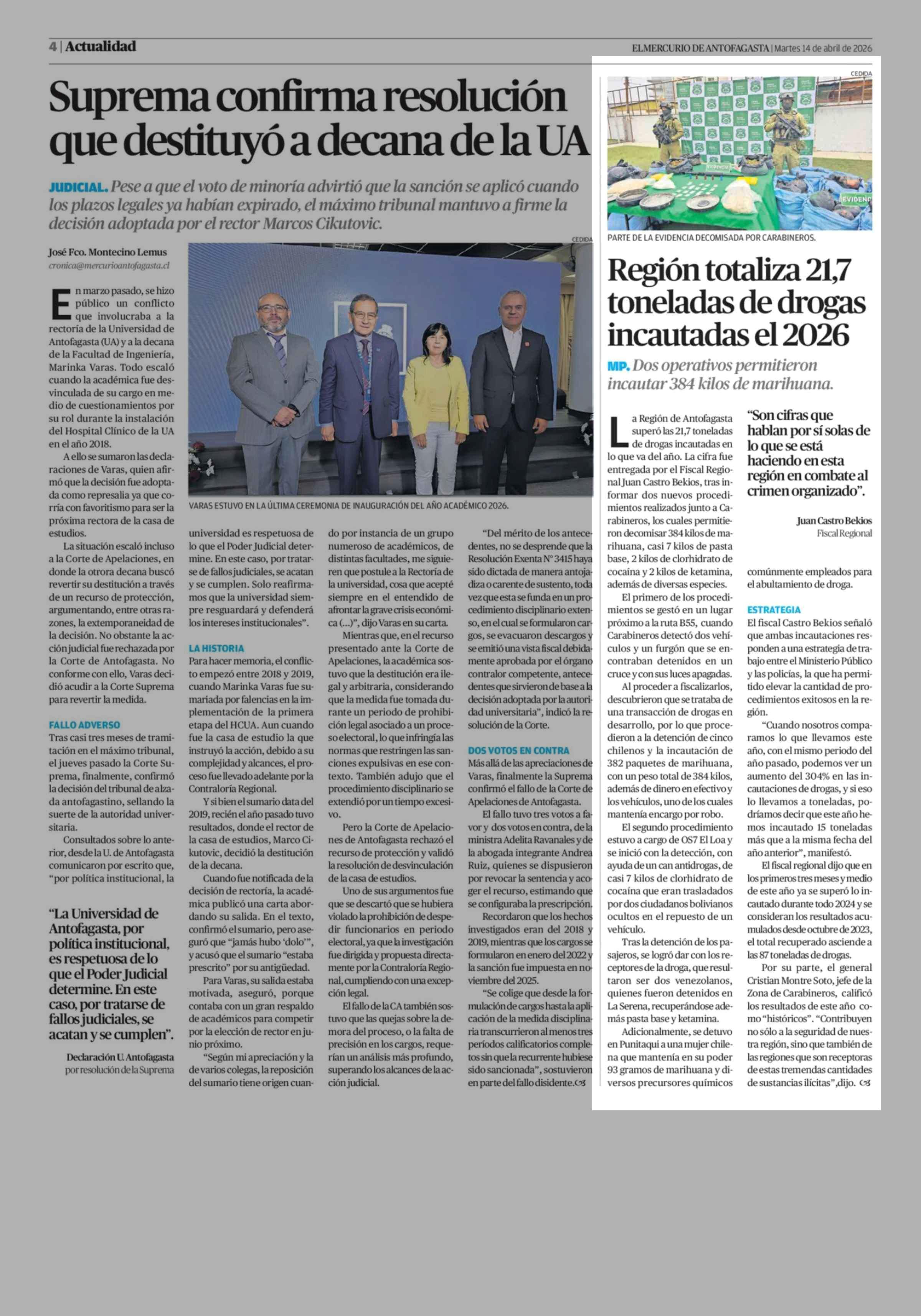 Región totaliza 21,7 toneladas de drogas incautadas el 2026 14-04-2026 El Mercurio de Antofagasta |
