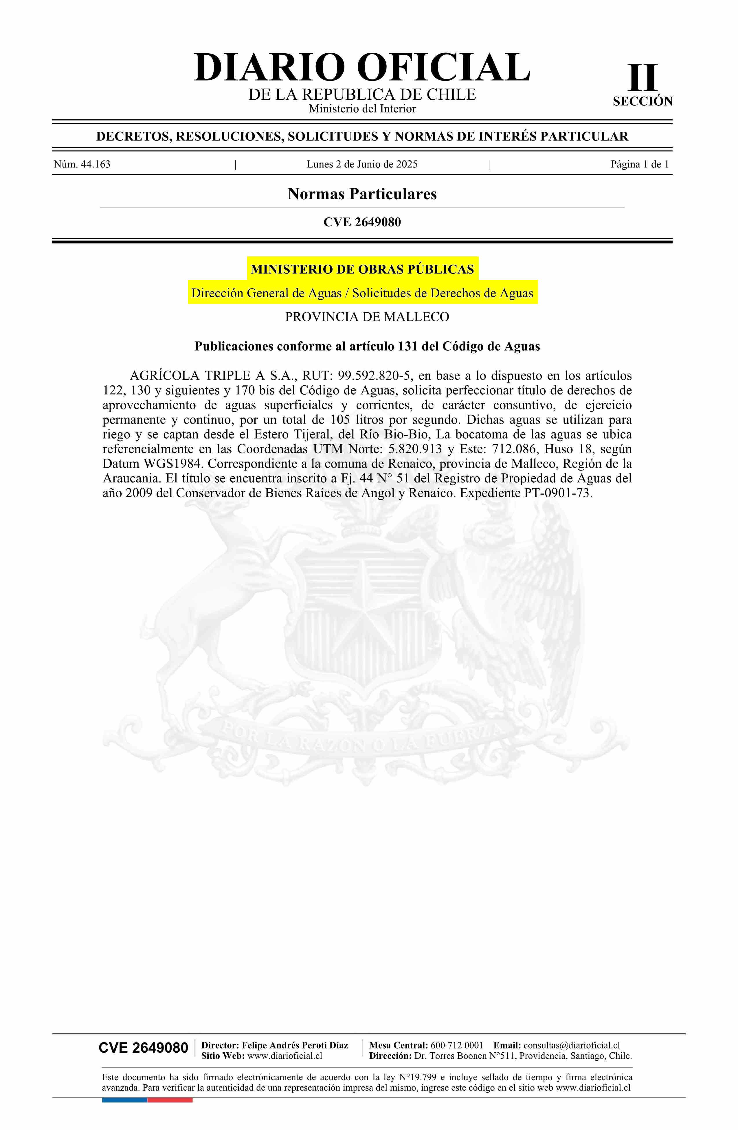 Solicitud Agrícola Triple A S.A. 02-06-2025 Diario Oficial Edición Electrónica |