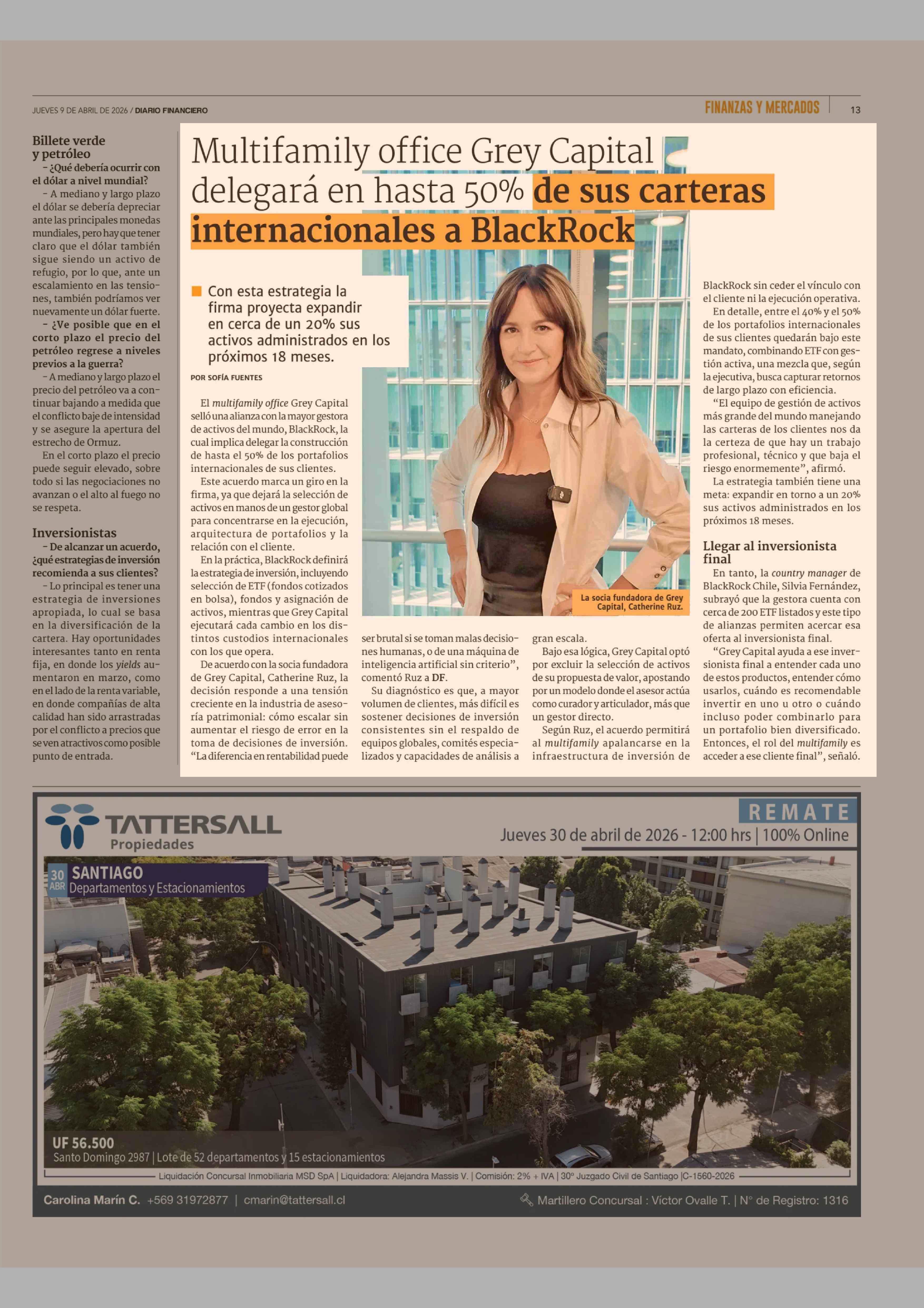 Multifamily office Grey Capital delegará en hasta 50% de sus carteras internacionales a BlackRock 09-04-2026 Diario Financiero |