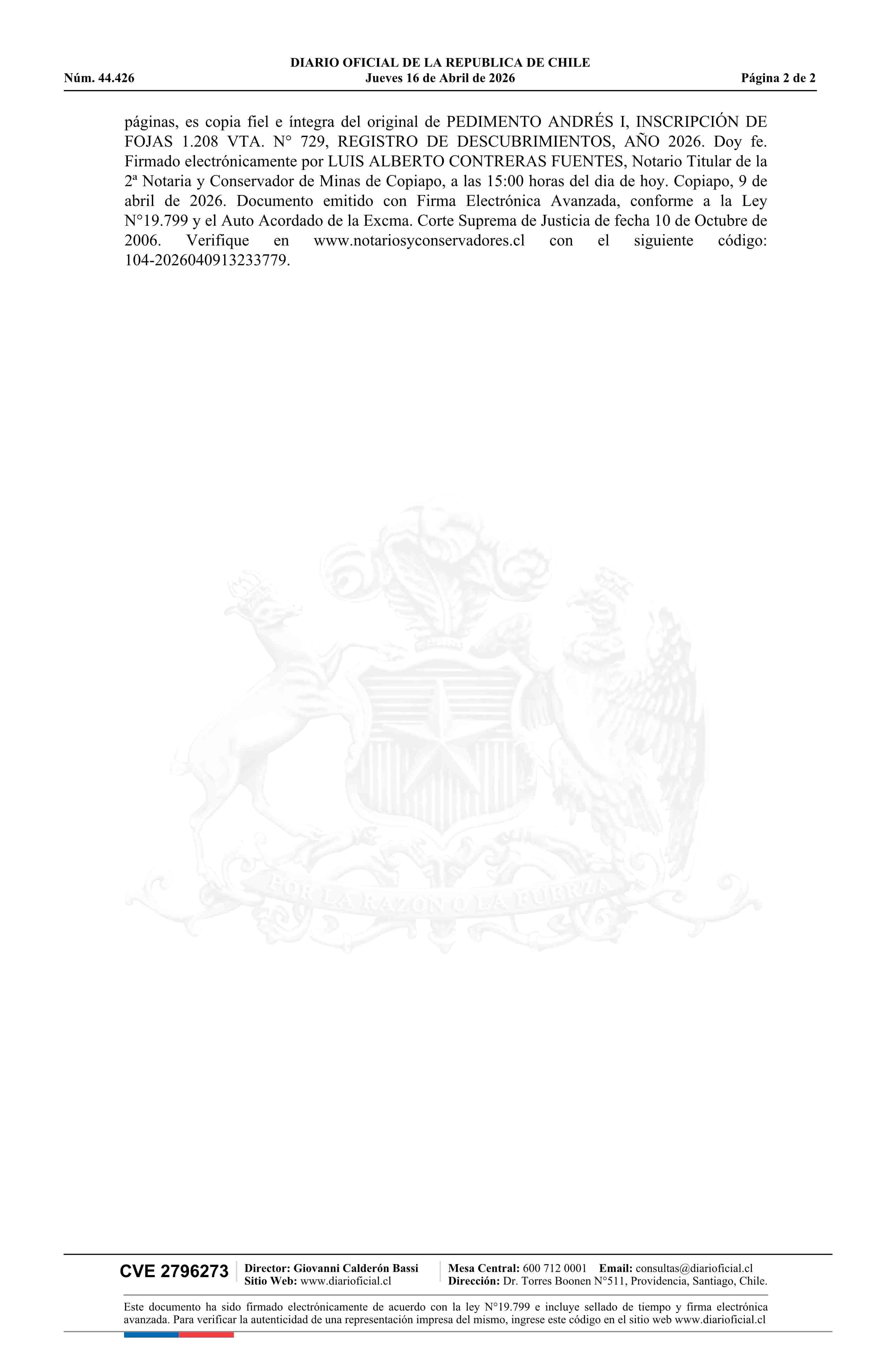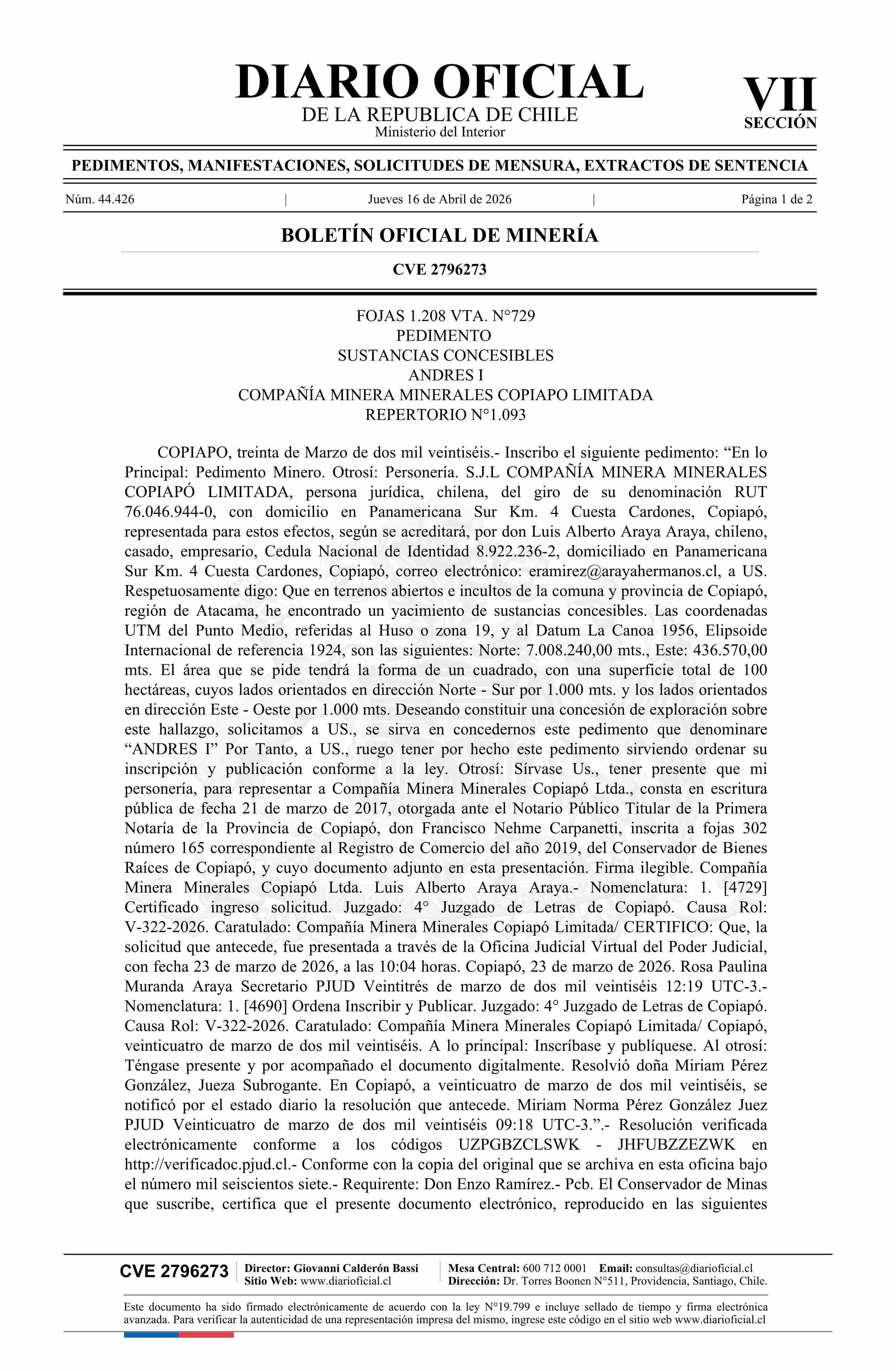 ANDRÉS I / Compañía Minera Minerales Copiapó Limitada 16-04-2026 DIARIO OFICIAL CHILE - BOLETÍN OFICIAL DE MINERÍA |