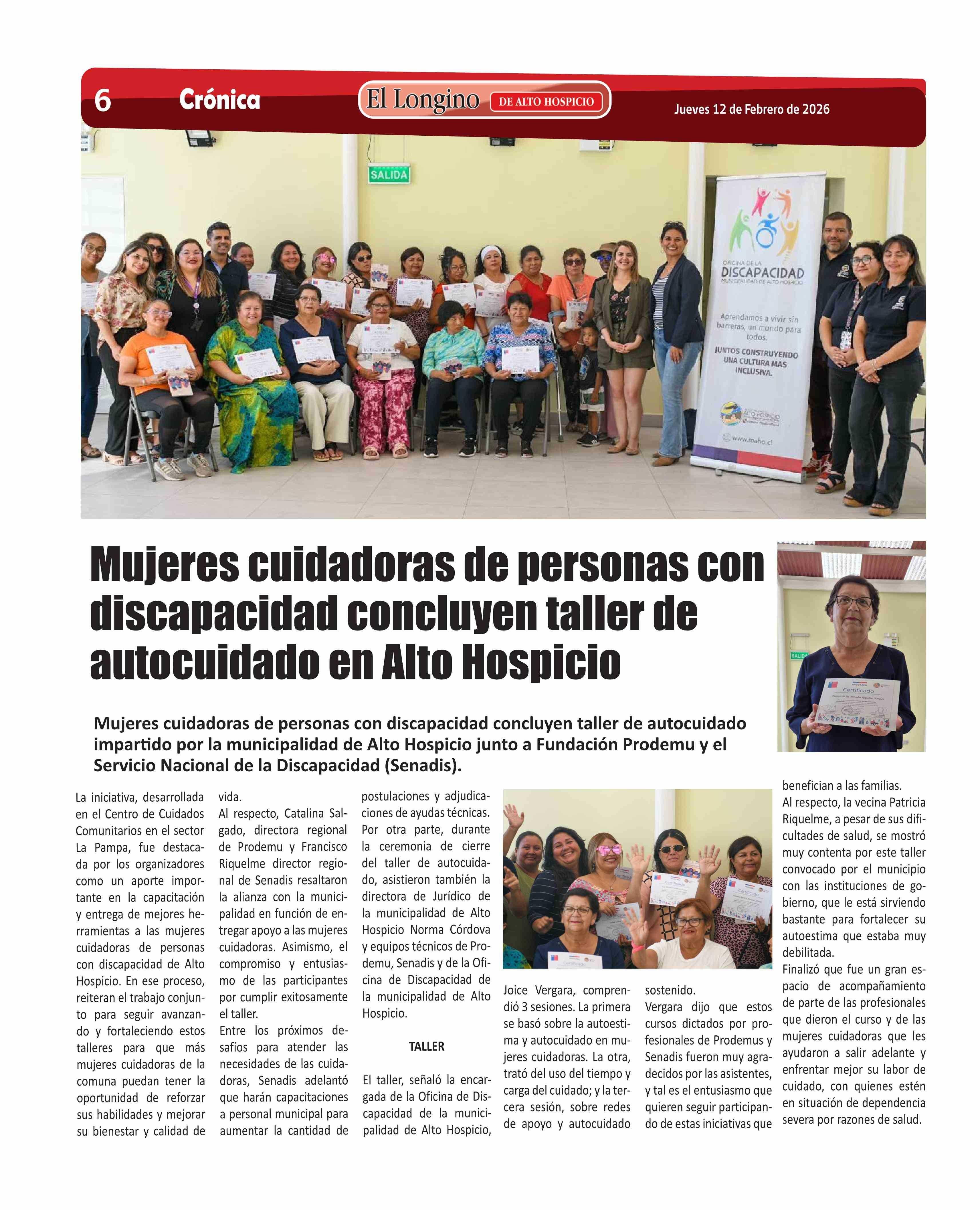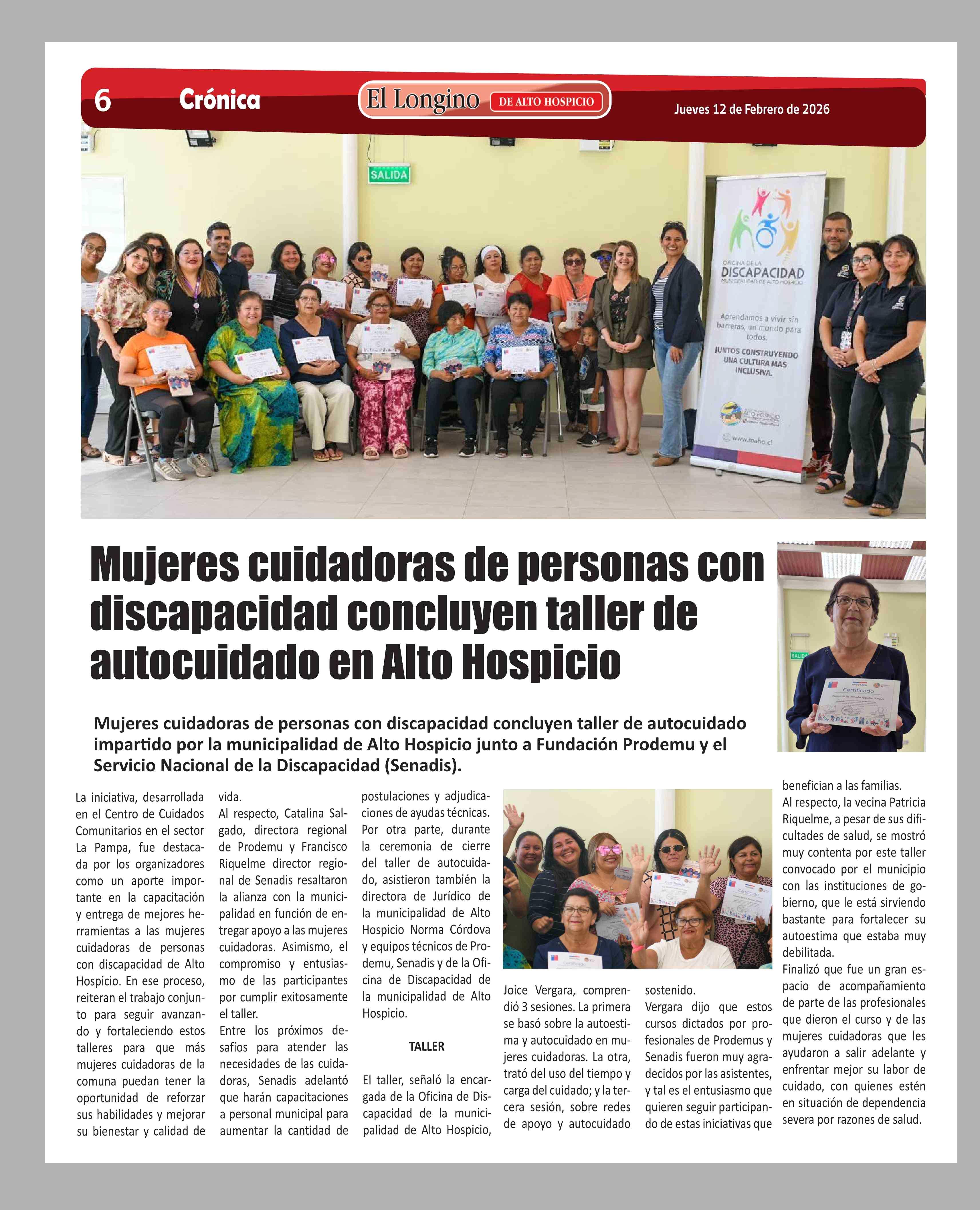 Mujeres cuidadoras de personas con discapacidad concluyen taller de autocuidado en Alto Hospicio 12-02-2026 El Longino |