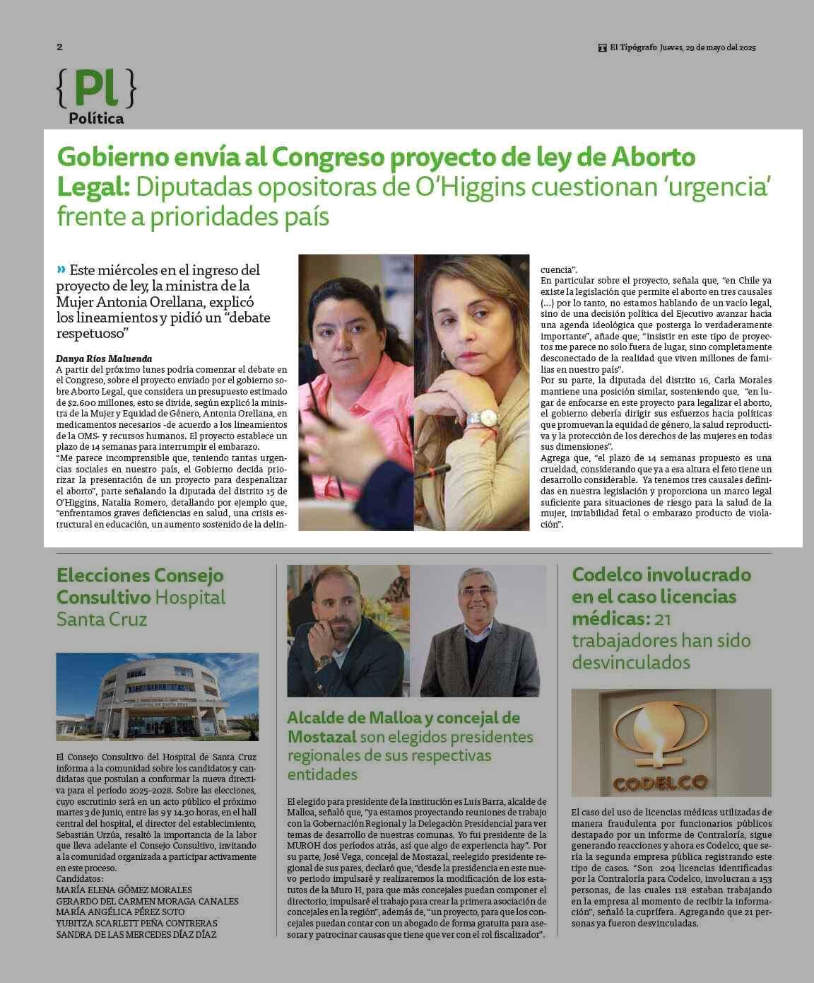 Gobierno envía al Congreso proyecto de ley de Aborto Legal: Diputadas opositoras de O'Higgins cuestionan 'urgencia' frente a prioridades país 29-05-2025 El Tipógrafo |