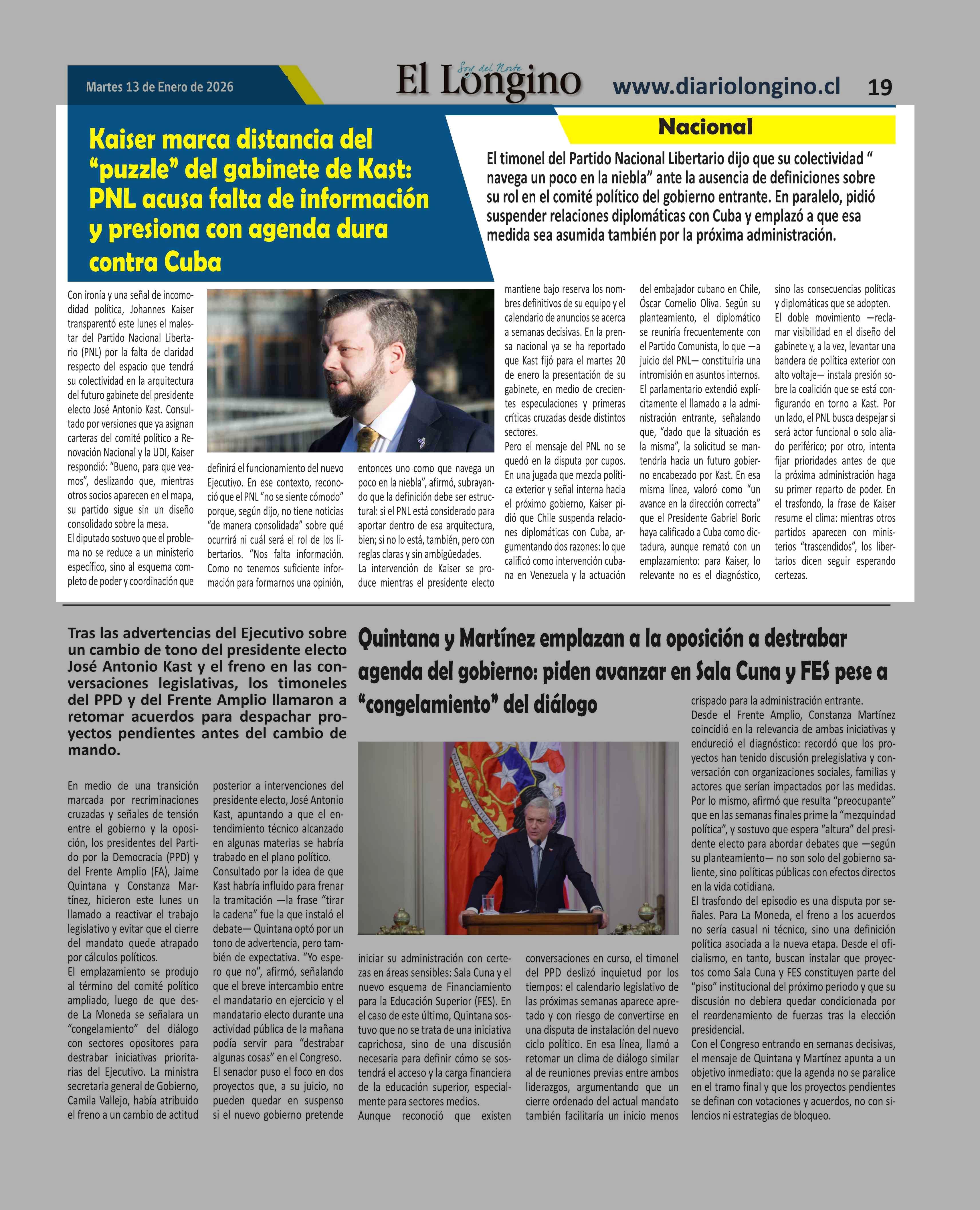 | Título: | Kaiser marca distancia del "puzzle" del gabinete de Kast: PNL acusa falta de información y presiona con agenda dura contra Cuba |