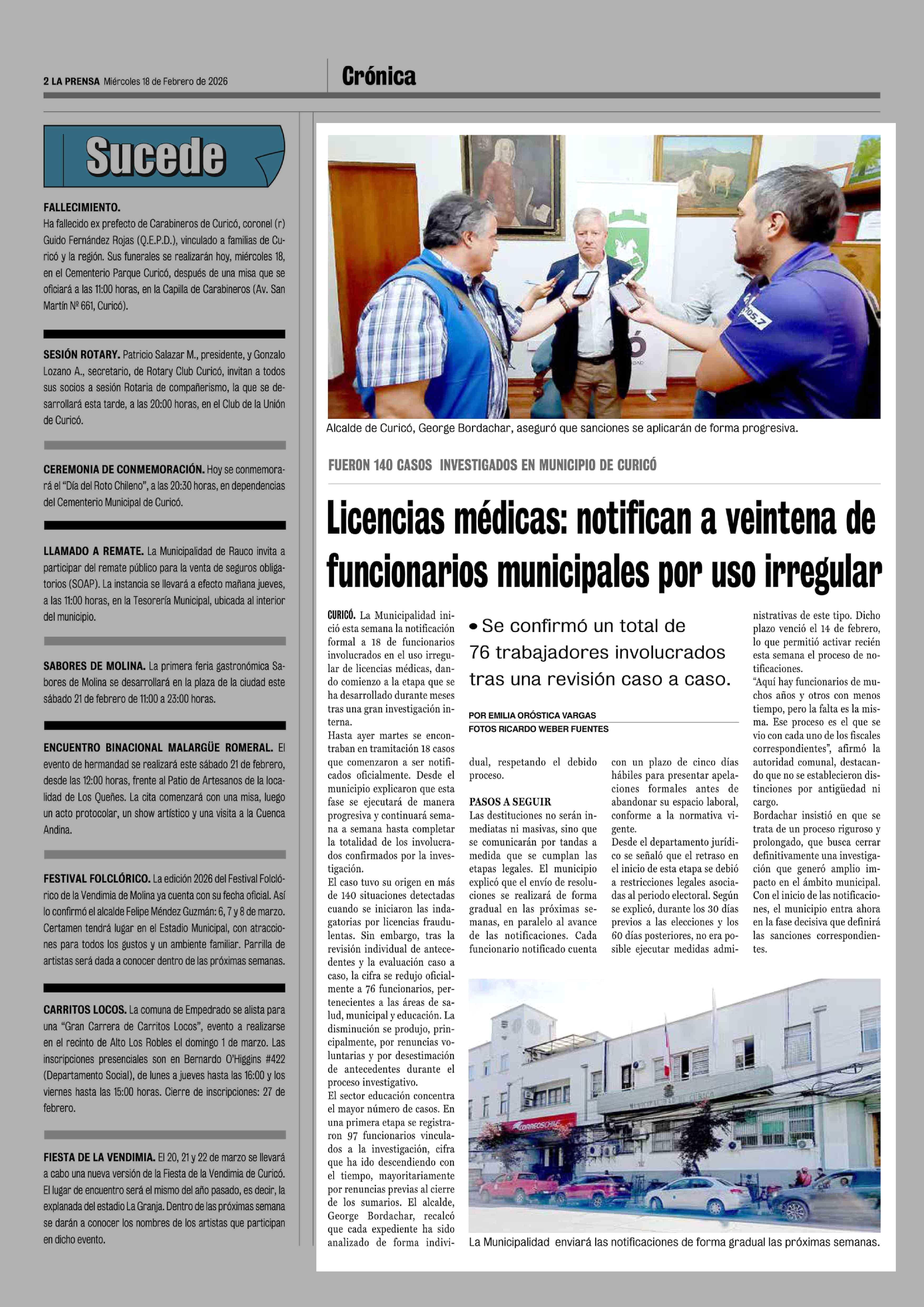 Licencias médicas: notifican a veintena de funcionarios municipales por uso irregular 18-02-2026 La Prensa de Curicó |