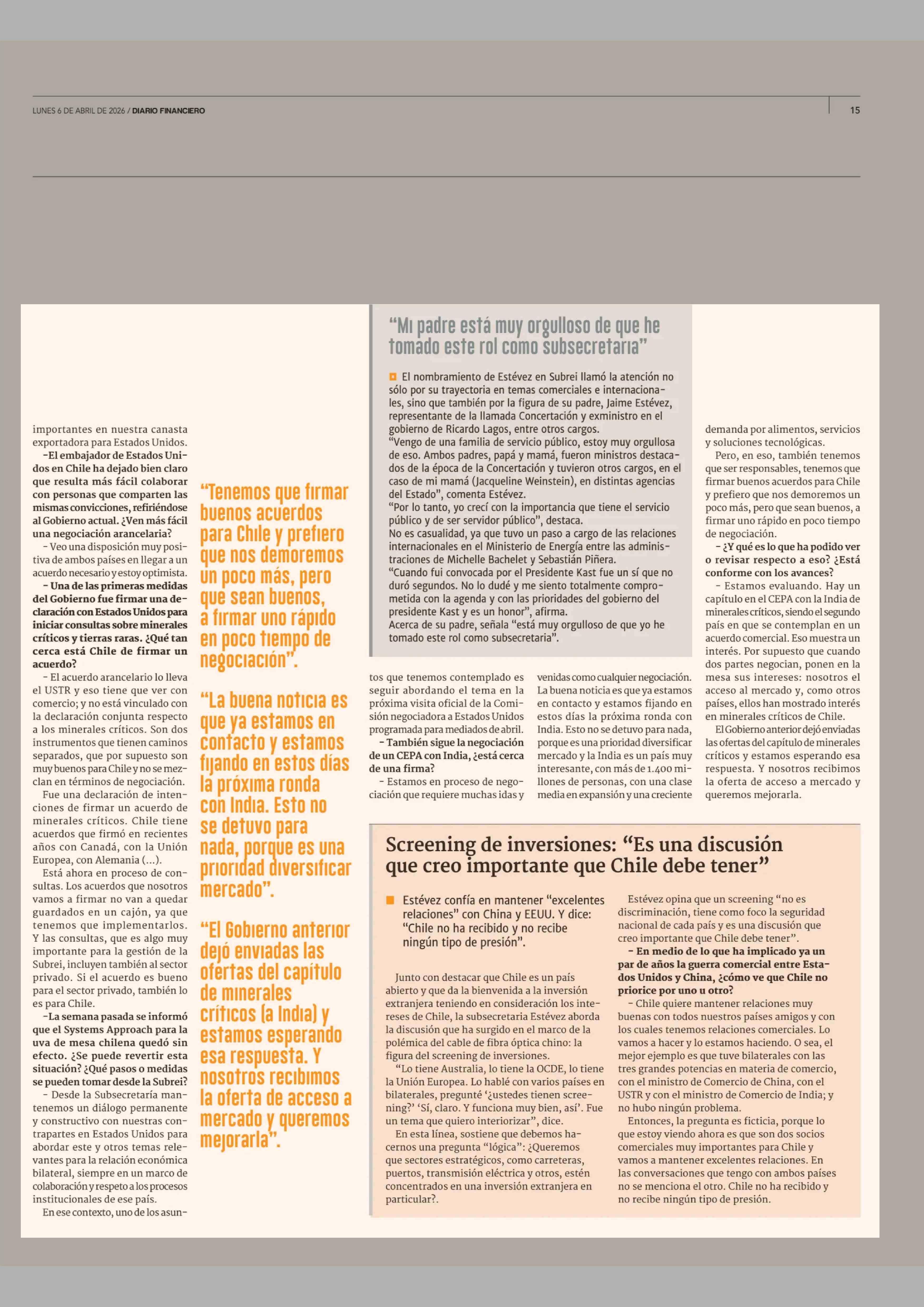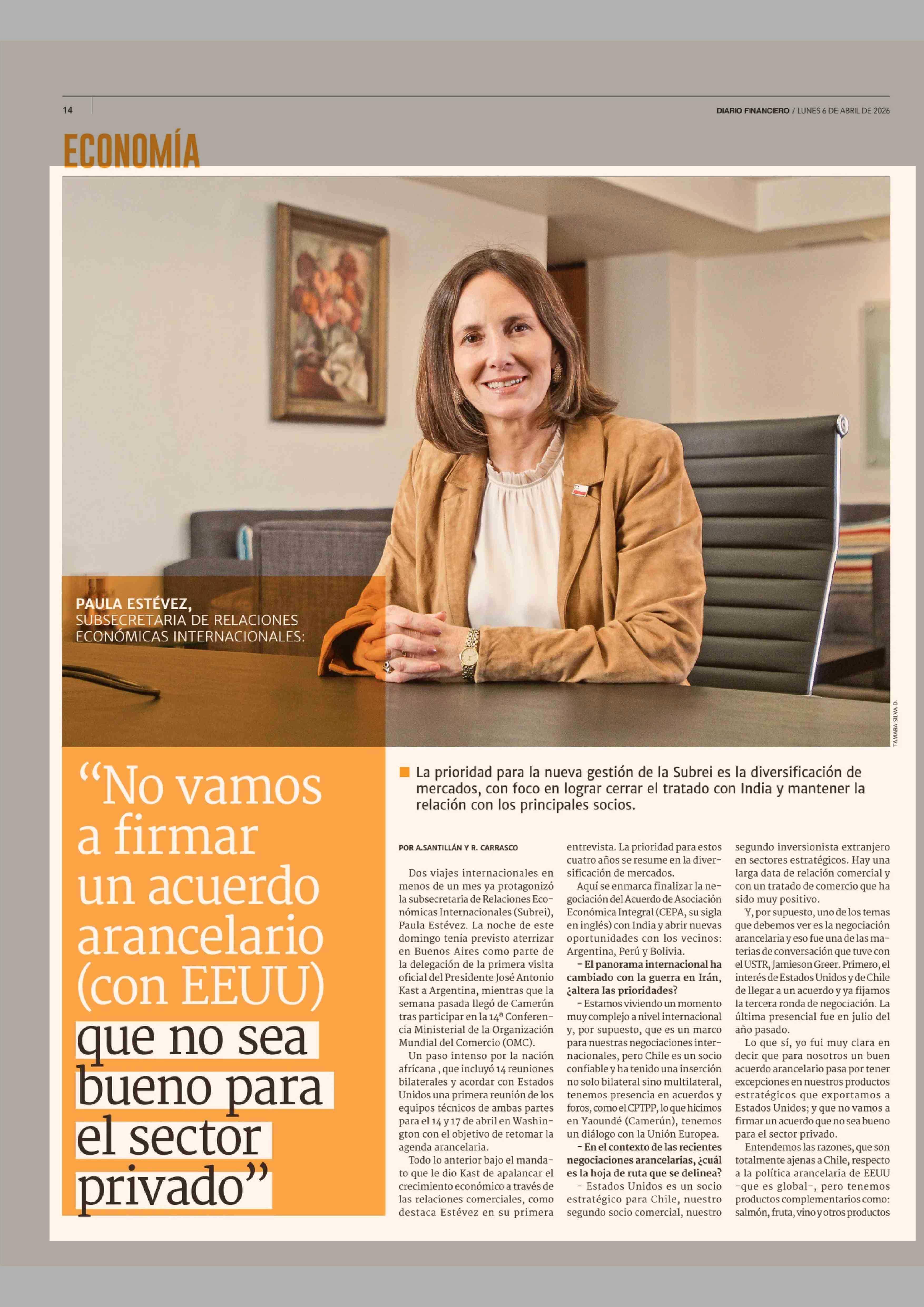 "No vamos a firmar un acuerdo arancelario (con EEUU) que no sea bueno para el sector privado' 06-04-2026 Diario Financiero |