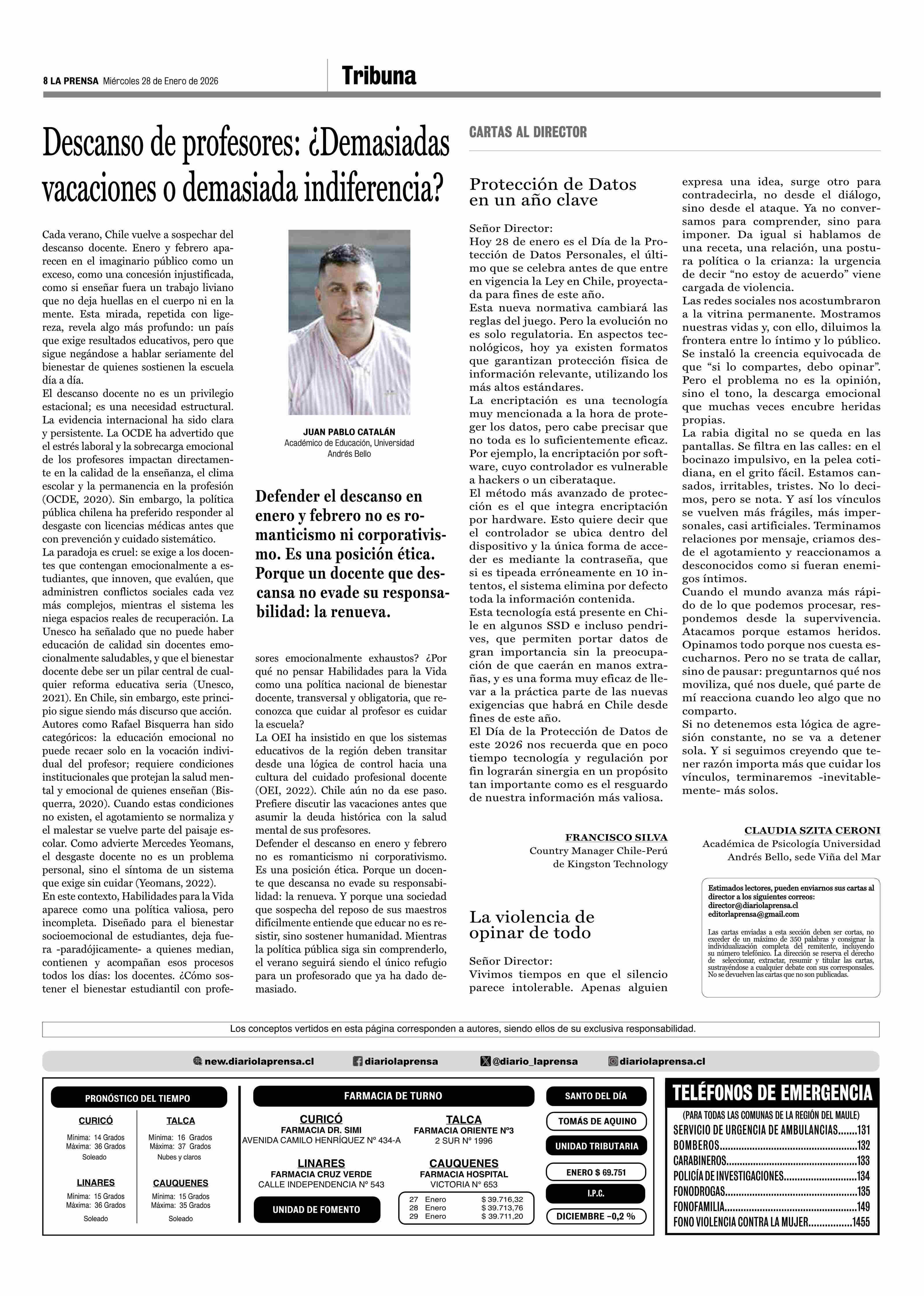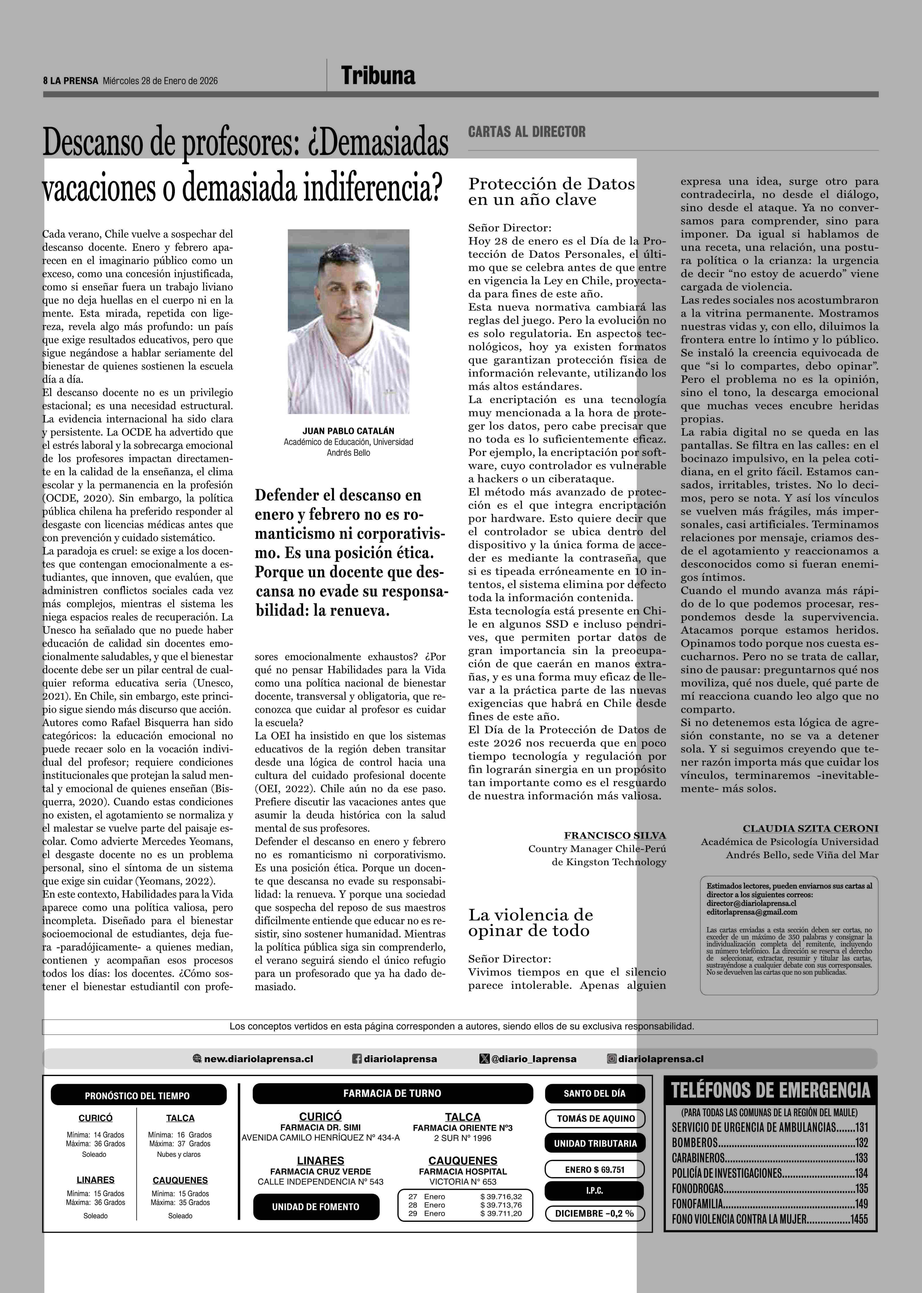 Columnas de Opinión: Descanso de profesores: ¿Demasiadas vacaciones o demasiada indiferencia? 28-01-2026 La Prensa de Curicó |