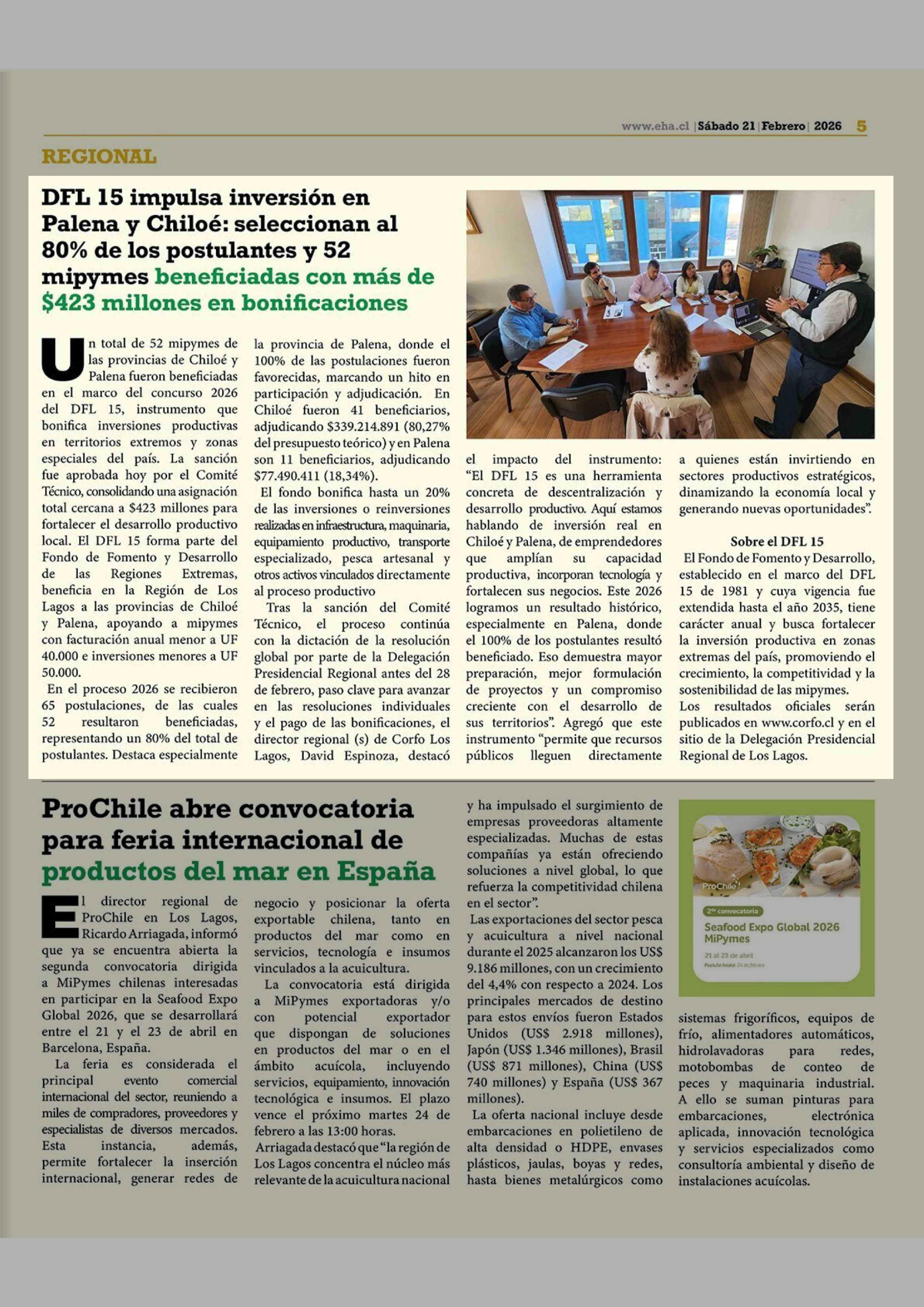 DFL 15 impulsa inversión en Palena y Chiloé: seleccionan al 80% de los postulantes y 52 mipymes beneficiadas con más de $423 millones en bonificaciones 21-02-2026 El Heraldo Austral |