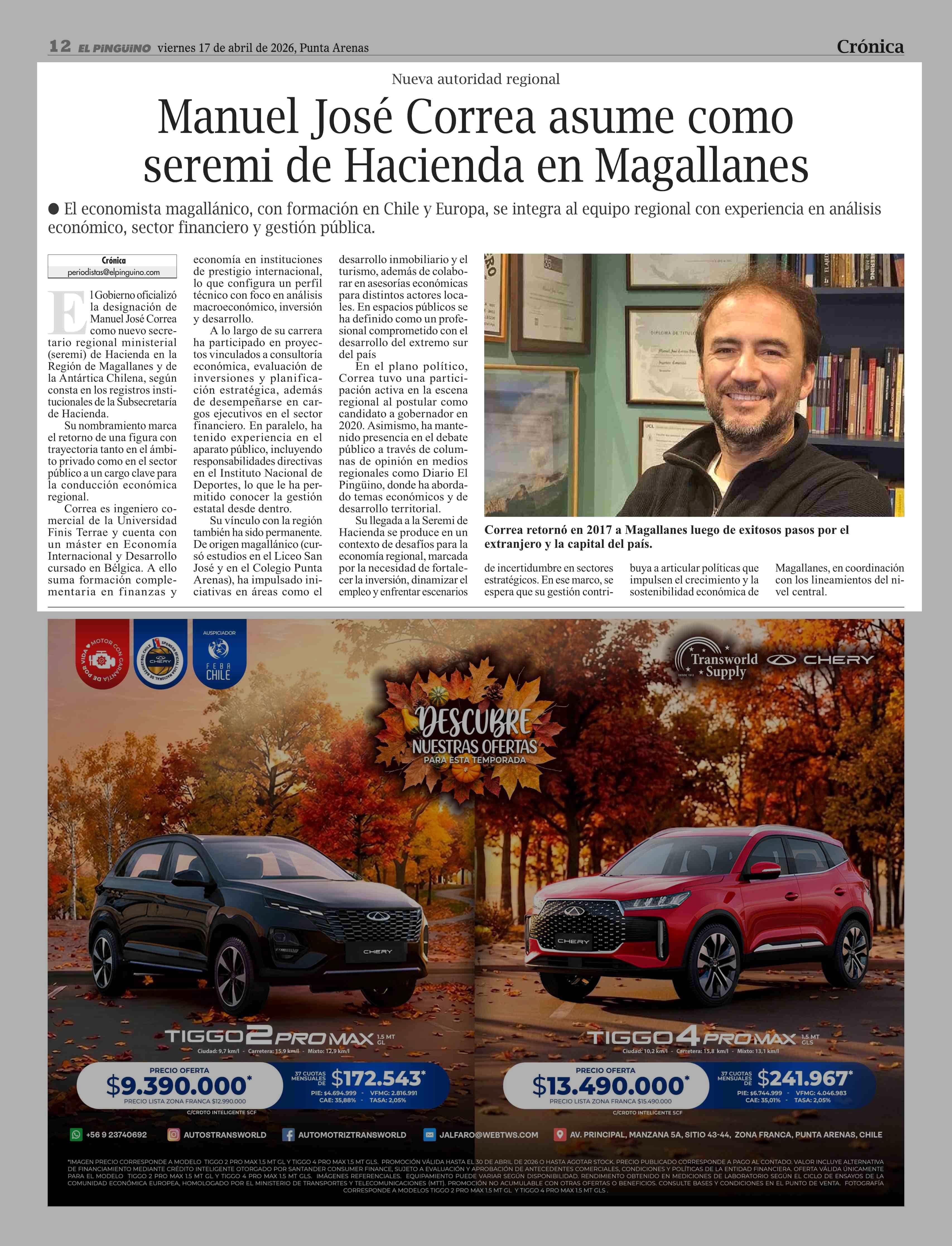 Manuel José Correa asume como seremi de Hacienda en Magallanes 17-04-2026 El Pingüino |