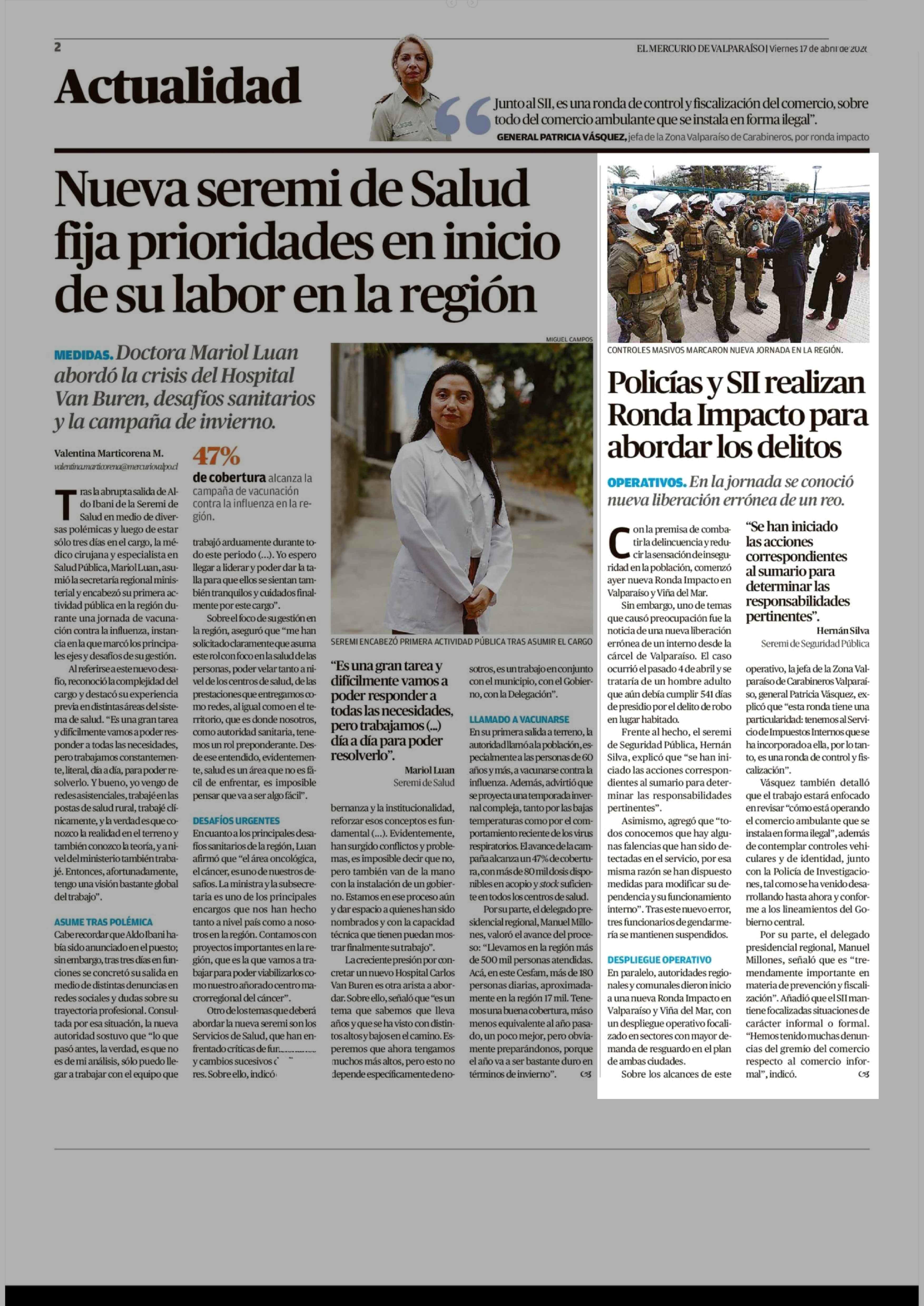 Policías y SII realizan Ronda Impacto para abordar los delitos 17-04-2026 El Mercurio de Valparaíso |