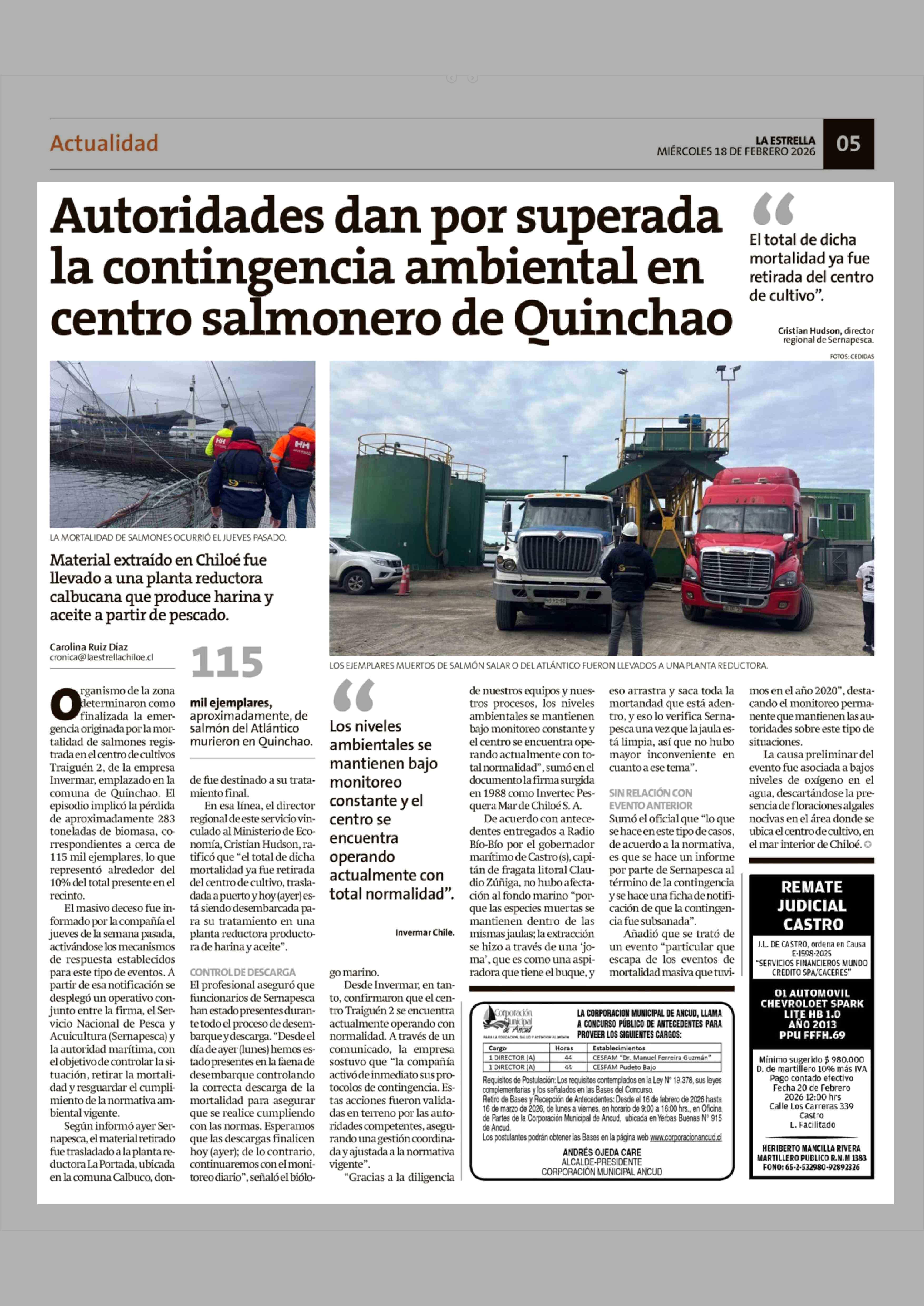 Título: Autoridades dan por superada la contingencia ambiental en centro salmonero de Quinchao