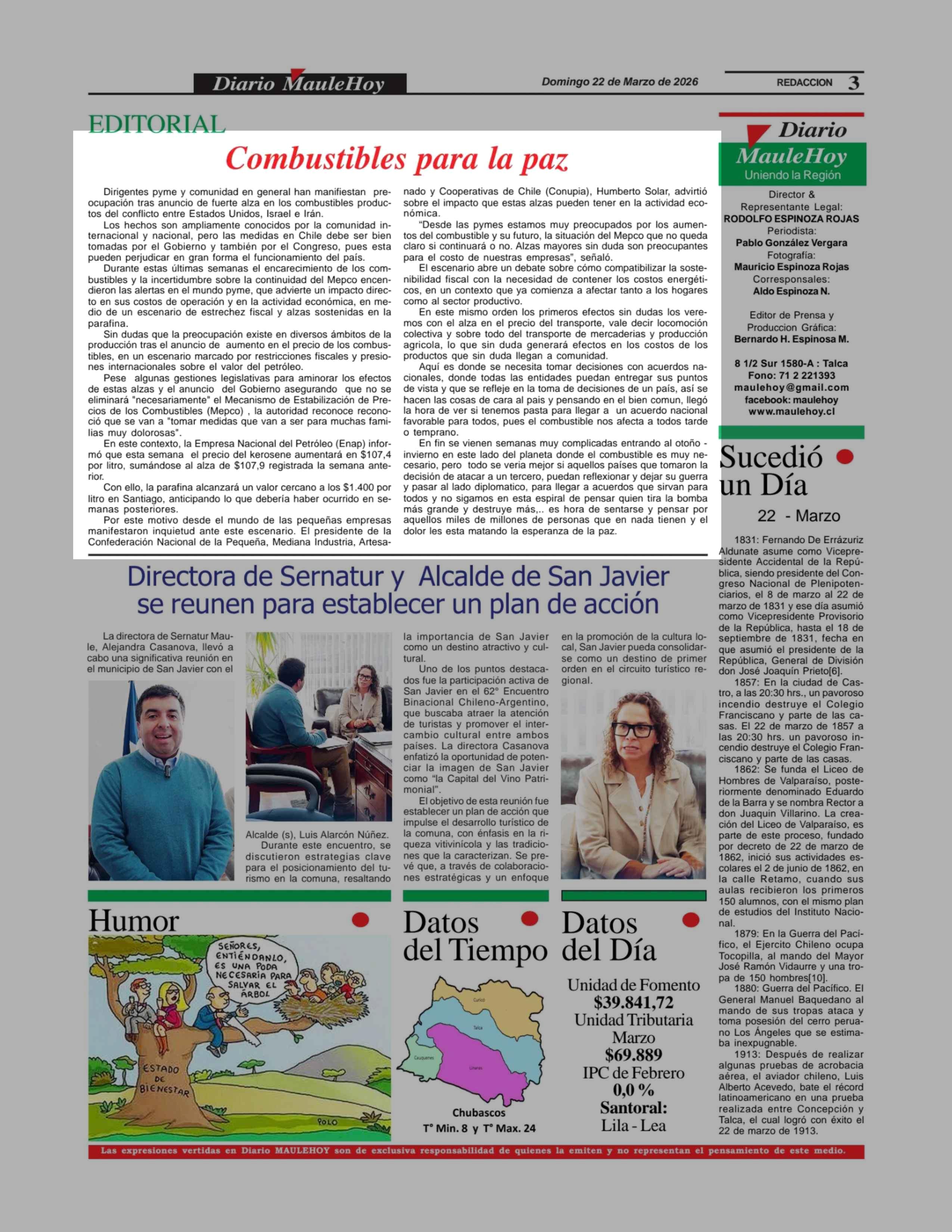 Editorial: Combustibles para la paz 22-03-2026 Maule Hoy |