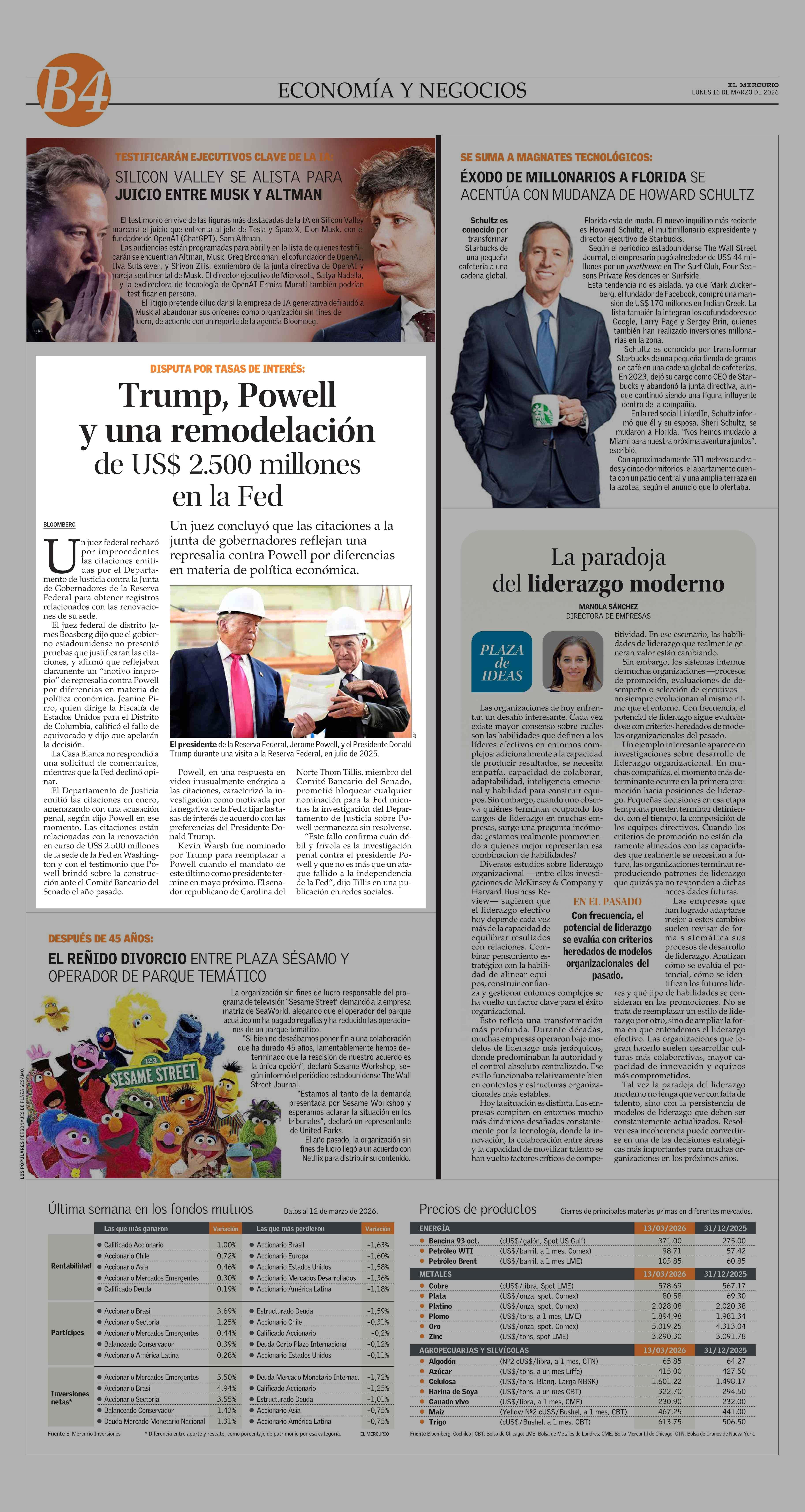Trump, Powell y una remodelación de US$ 2.500 millones en la Fed 16-03-2026 El Mercurio |