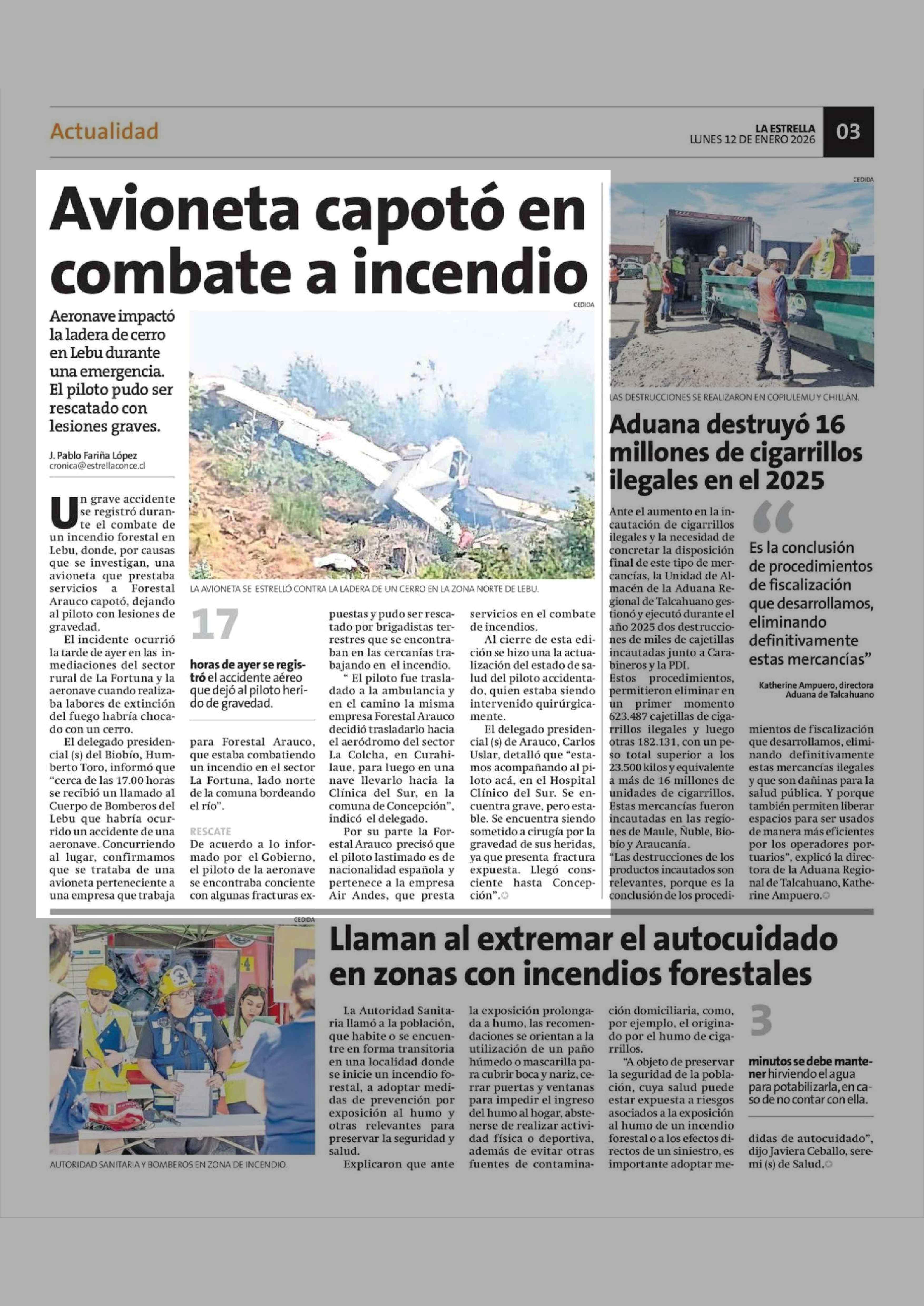 Avioneta capotó en combate a incendio 12-01-2026 La Estrella de Concepción |
