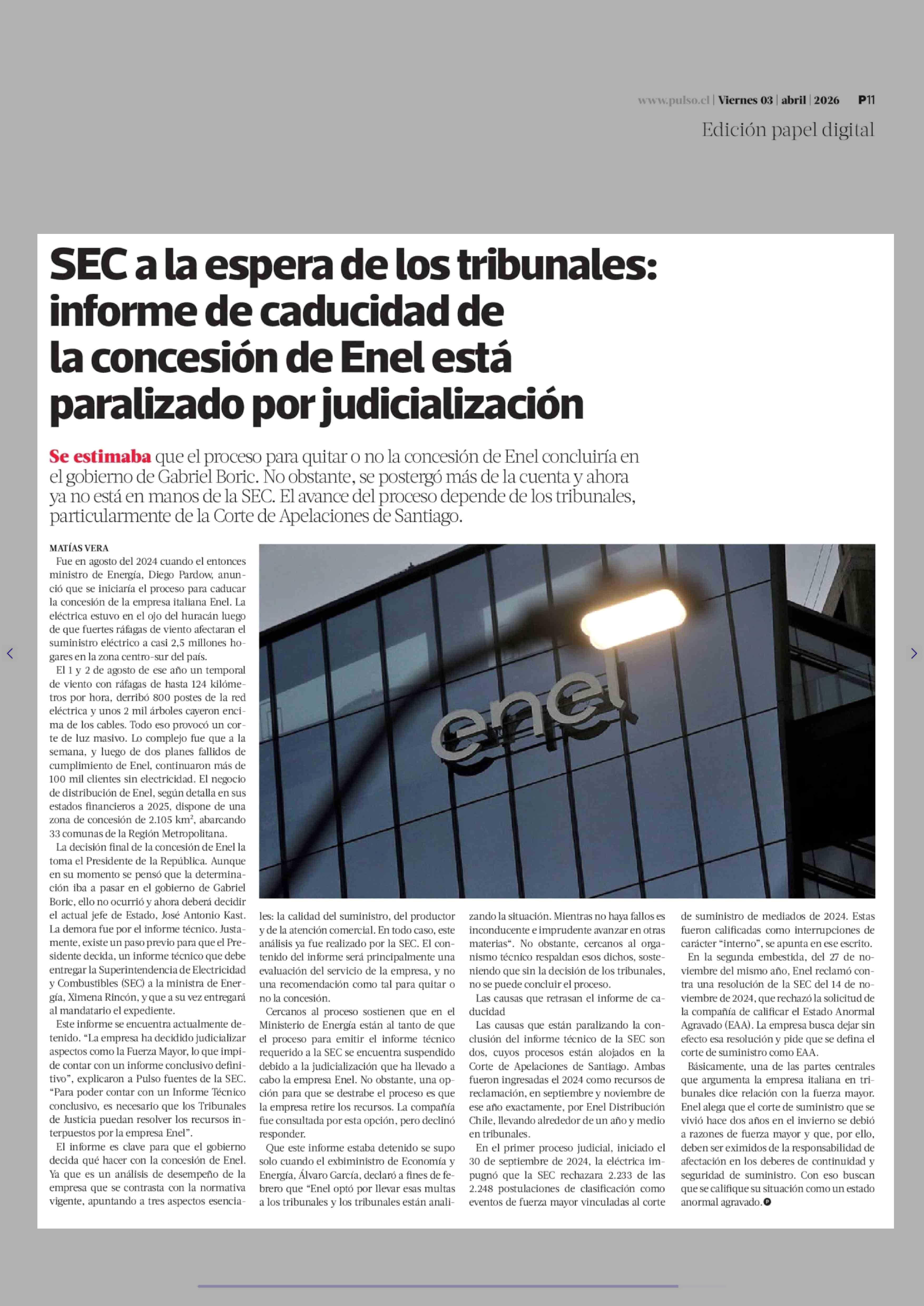 SEC a la espera de los tribunales: informe de caducidad de la concesión de Enel está paralizado por judicialización 03-04-2026 La Tercera |