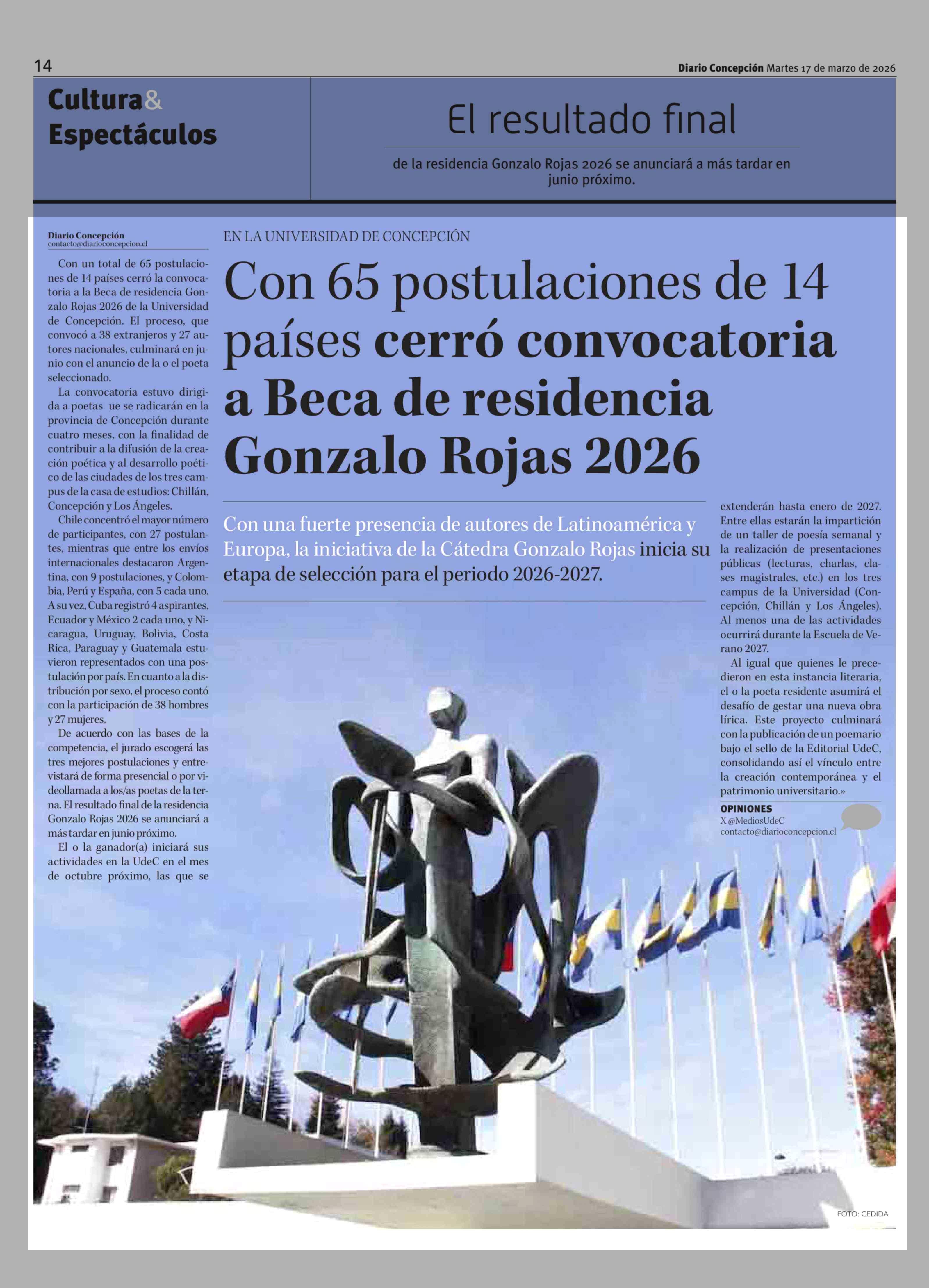 Con 65 postulaciones de 14 países cerró convocatoria a Beca de residencia Gonzalo Rojas 2026 17-03-2026 Diario Concepción |