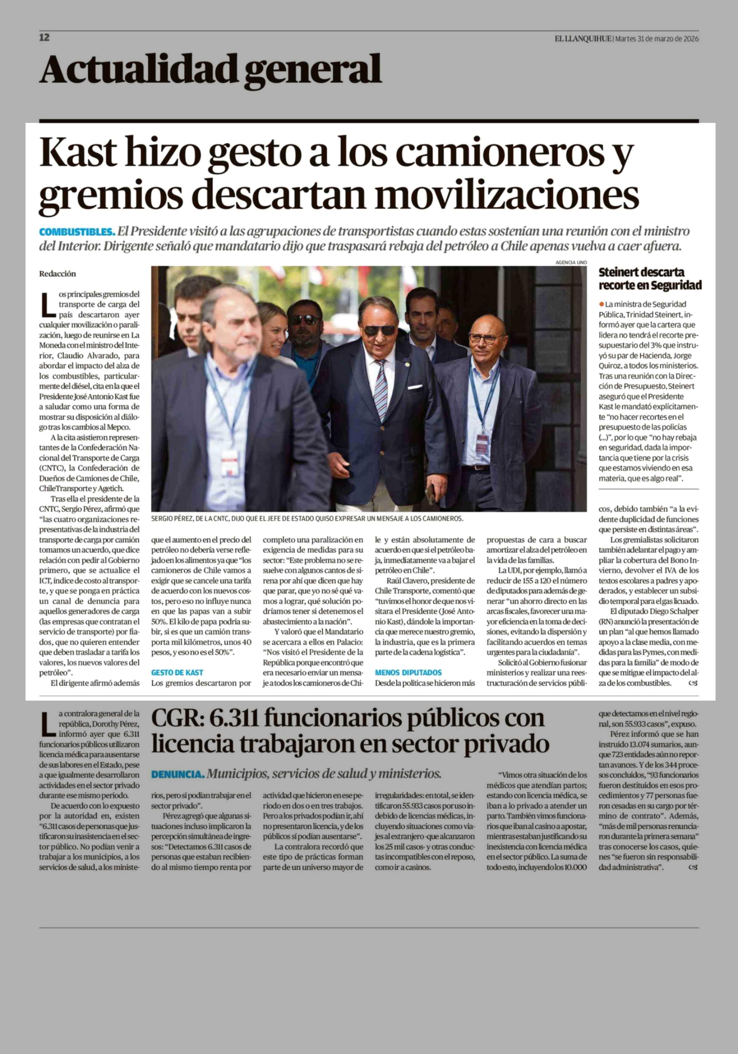 Kast hizo gesto a los camioneros y gremios descartan movilizaciones 31-03-2026 El Llanquihue |