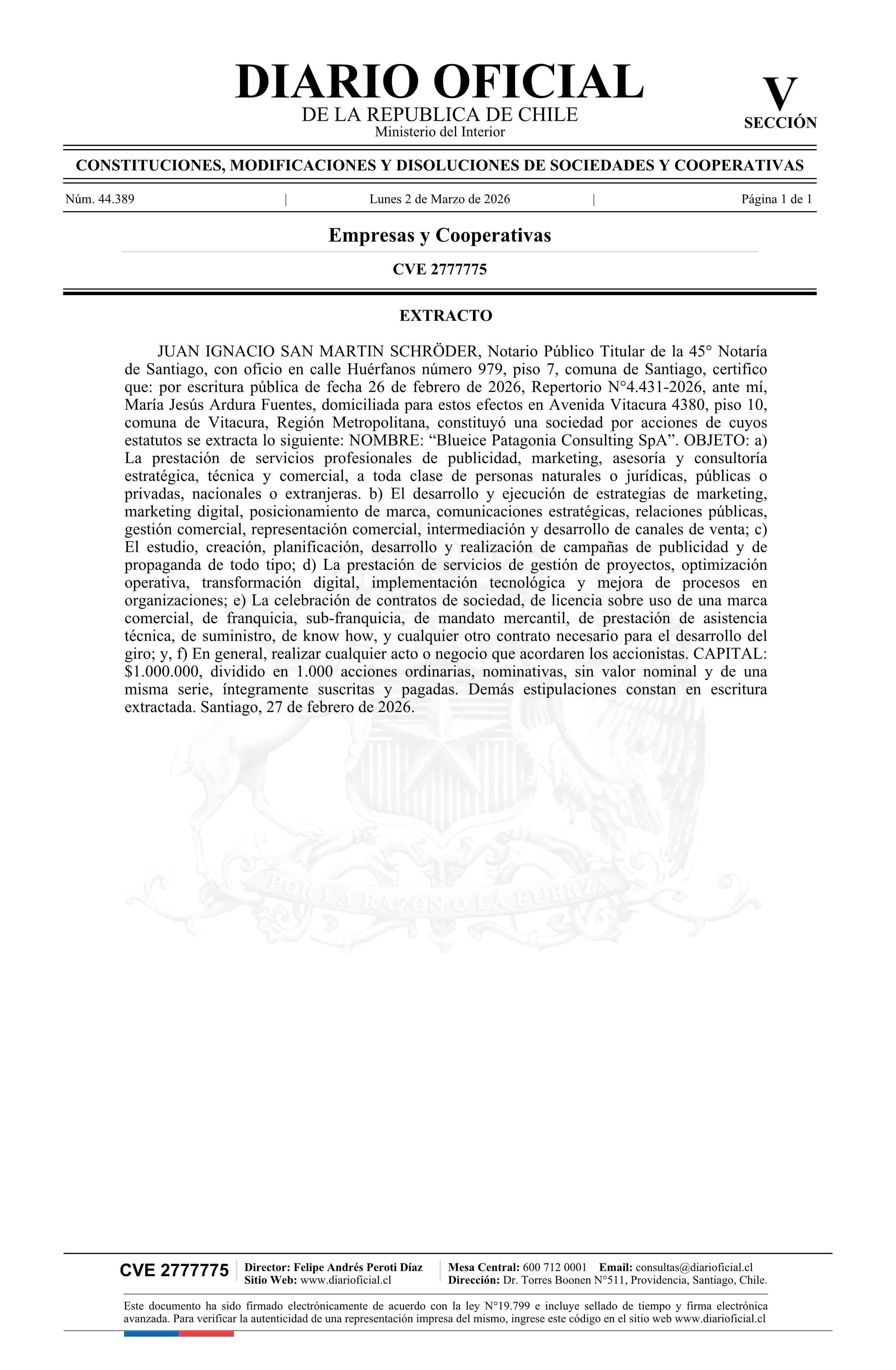 Blueice Patagonia Consulting SpA 02-03-2026 Diario Oficial Edición Electrónica |