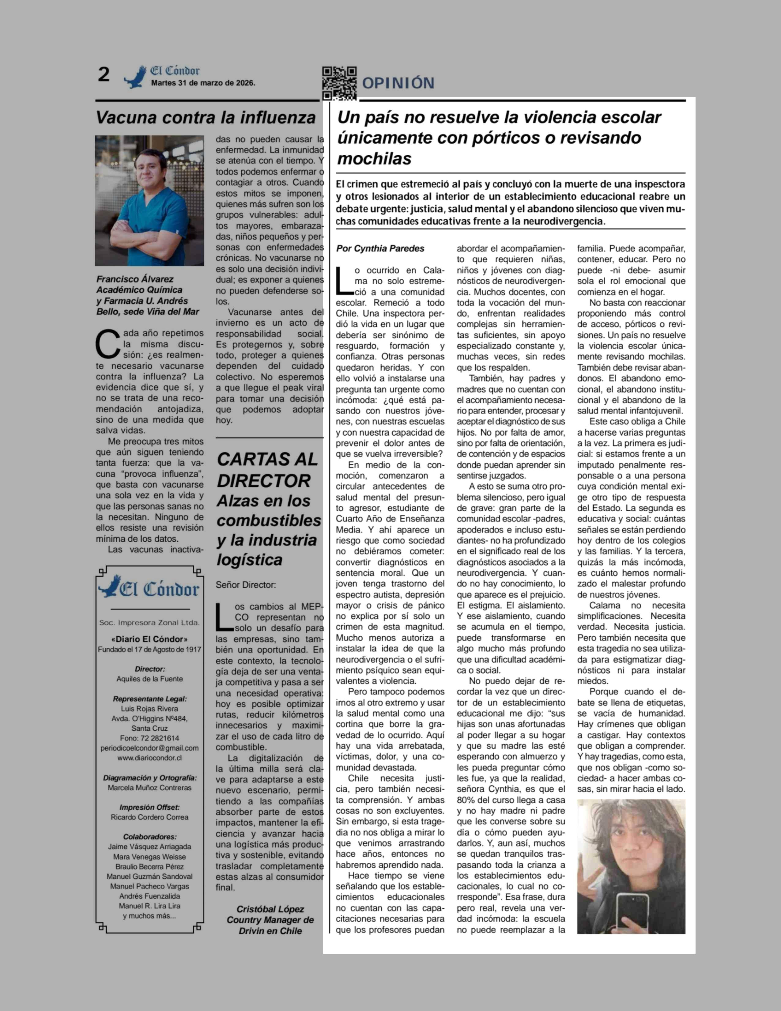 Columnas de Opinión: Un país no resuelve la violencia escolar únicamente con pórticos o revisando mochilas 31-03-2026 Diario El Cóndor |