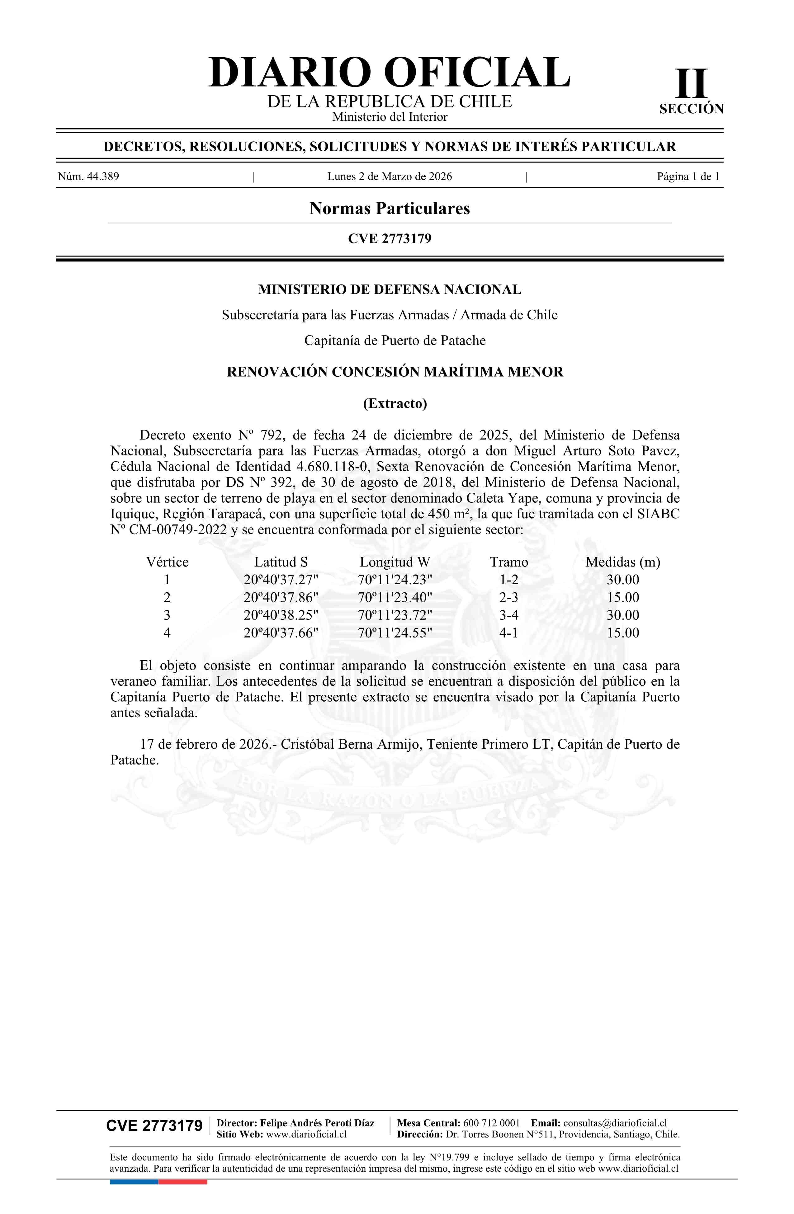 Extracto de decreto exento número 792, de 2025.- Renovación de concesión marítima menor 02-03-2026 Diario Oficial Edición Electrónica |