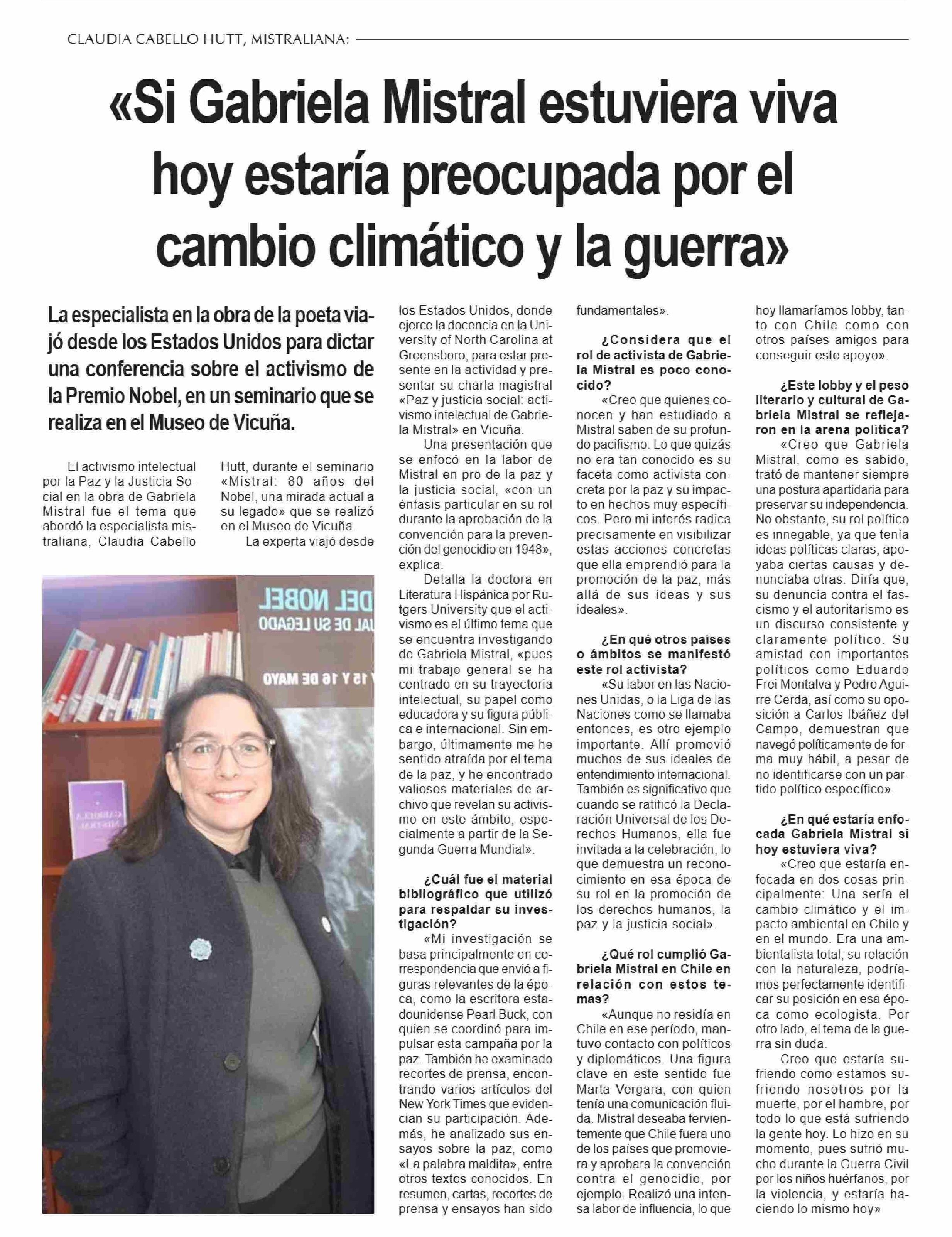 | Título: | «Si Gabriela Mistral estuviera viva hoy estaría preocupada por el cambio climático y la querra» |