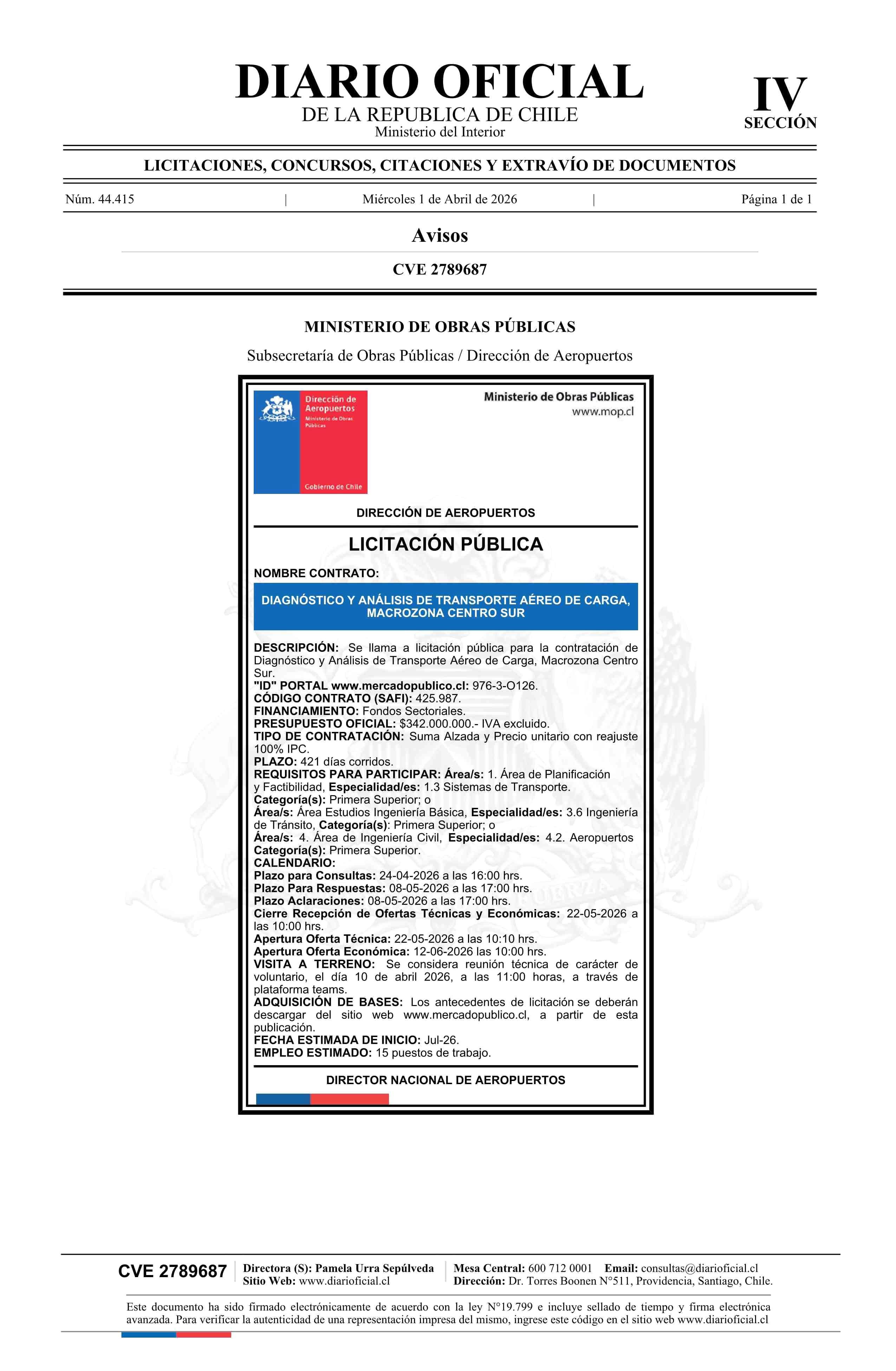 Título: AVISO LICITACIONES: Diagnóstico y Análisis de Transporte Aéreo de Carga, Macrozona Centro Sur
