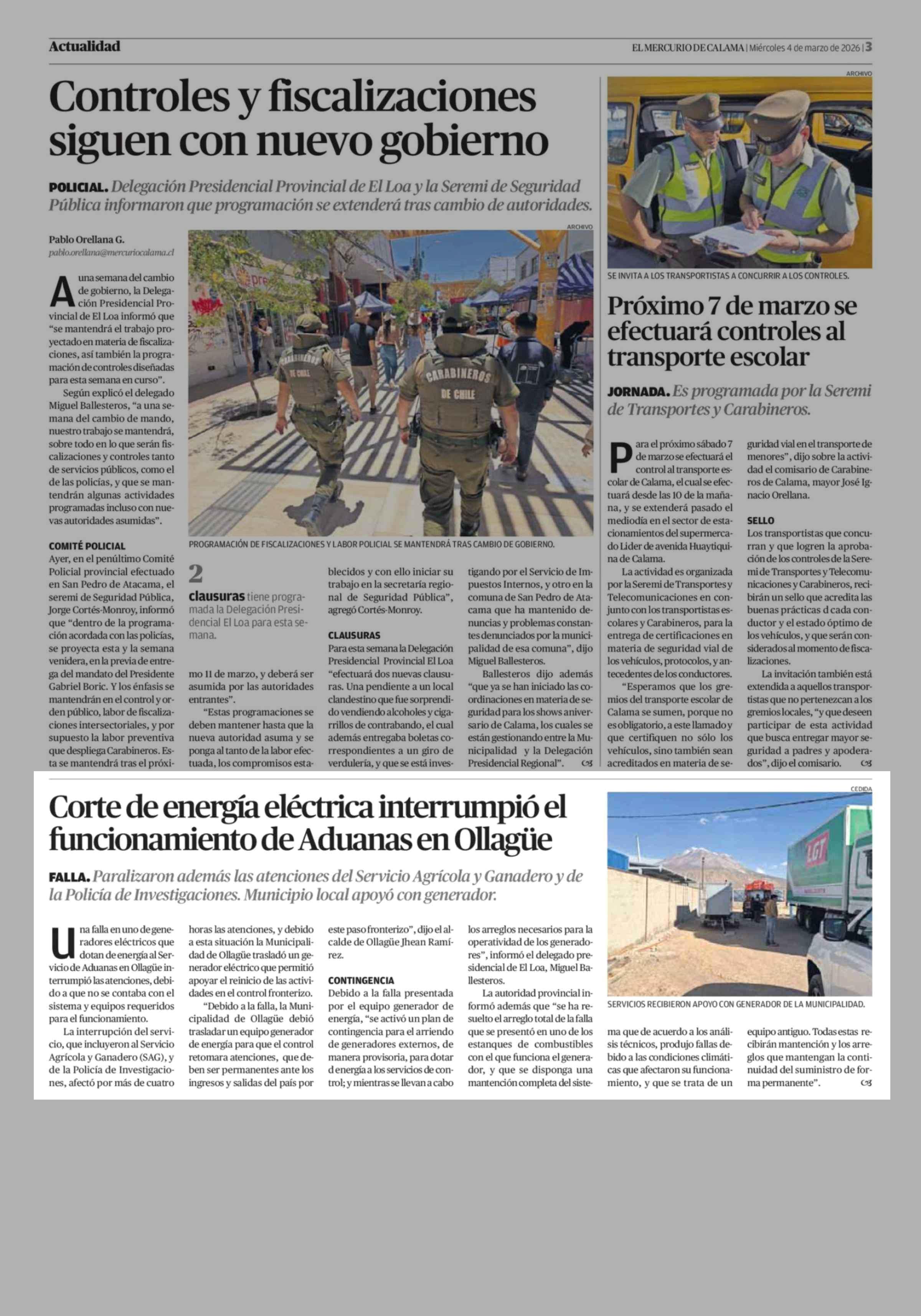 Corte de energía eléctrica interrumpió el funcionamiento de Aduanas en Ollagüe 04-03-2026 El Mercurio de Calama |