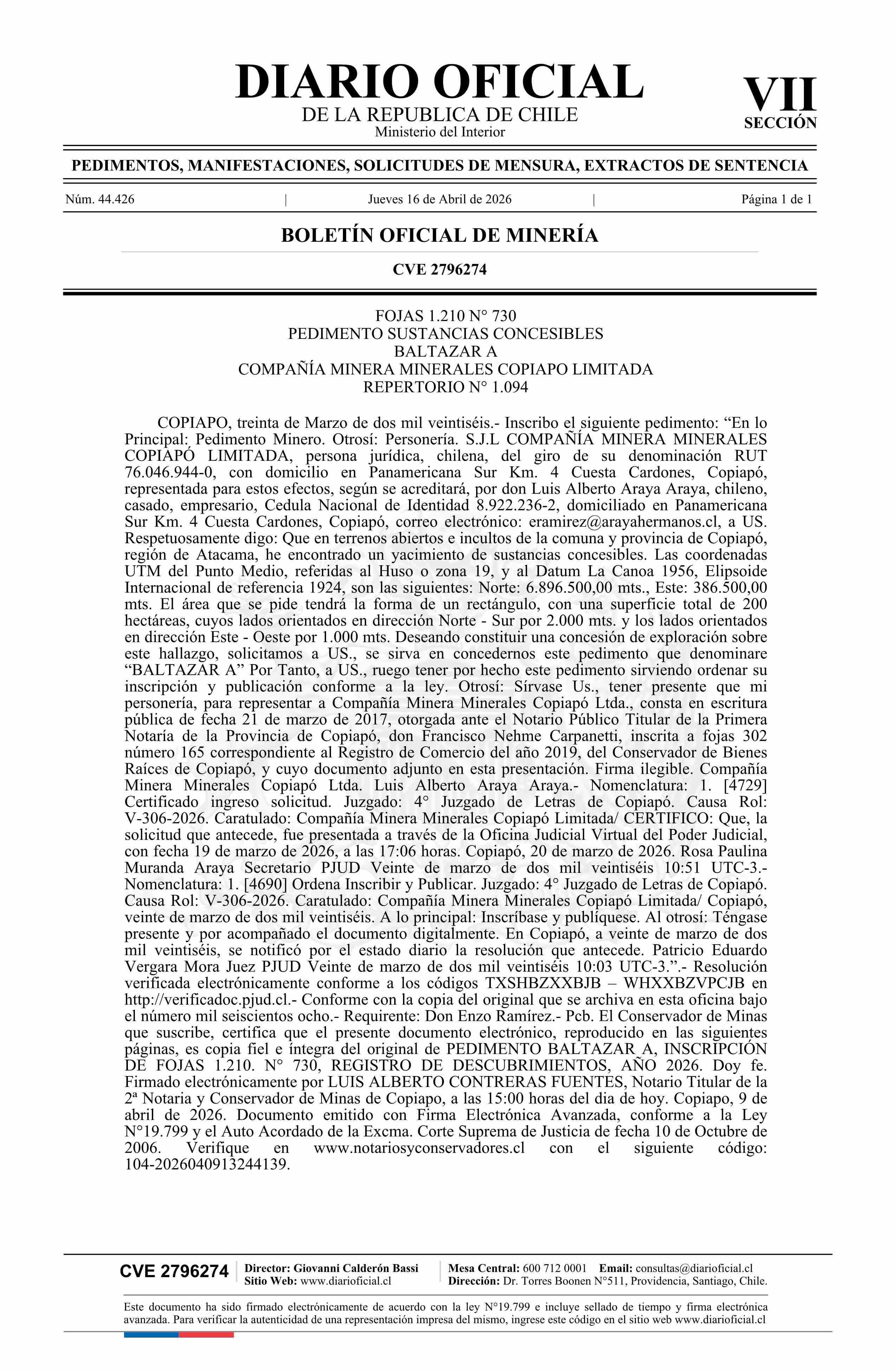 BALTAZAR A / Compañía Minera Minerales Copiapo Limitada 16-04-2026 DIARIO OFICIAL CHILE - BOLETÍN OFICIAL DE MINERÍA |