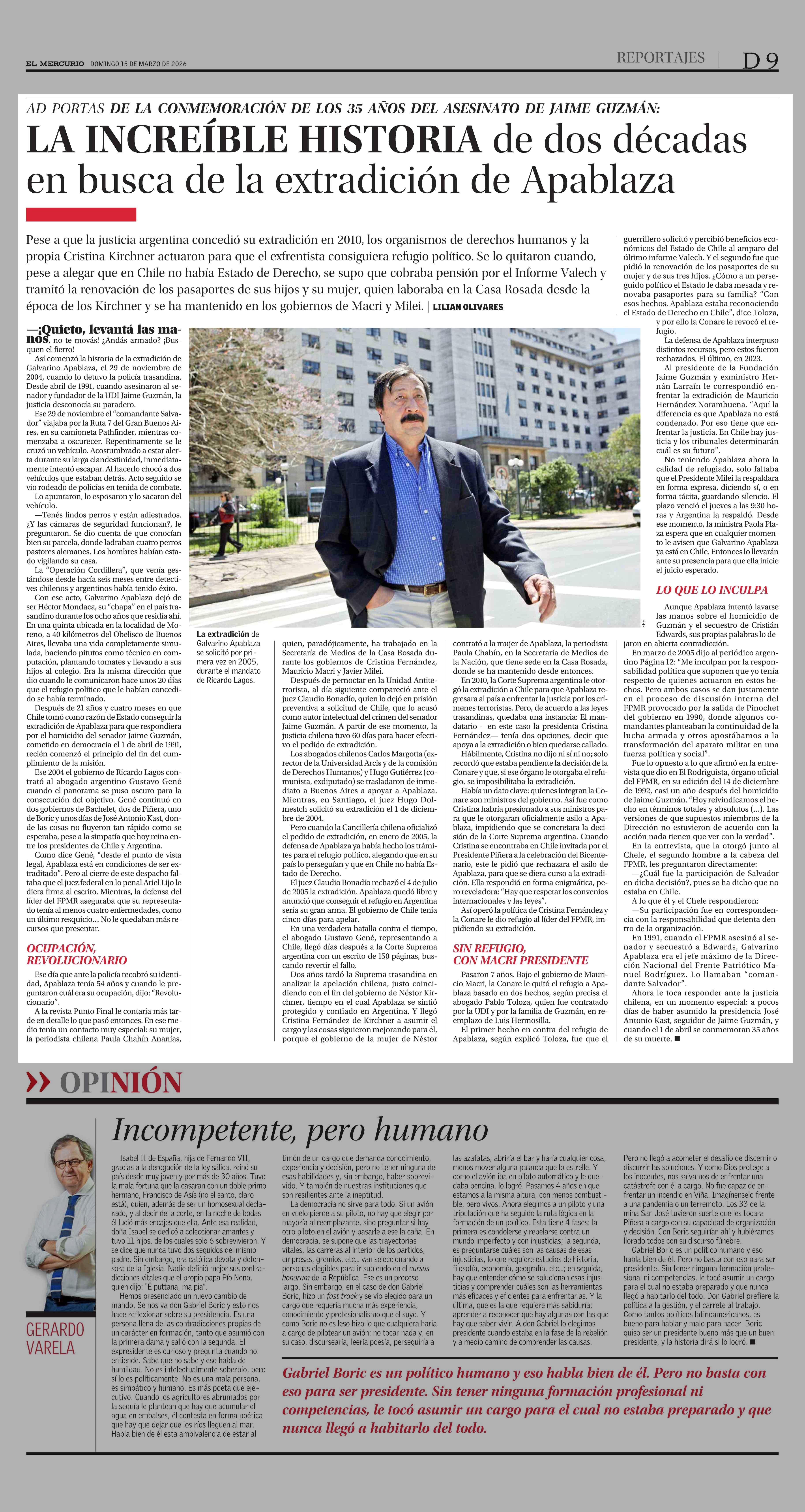 LA INCREÍBLE HISTORIA de dos décadas en busca de la extradición de Apablaza 15-03-2026 El Mercurio |