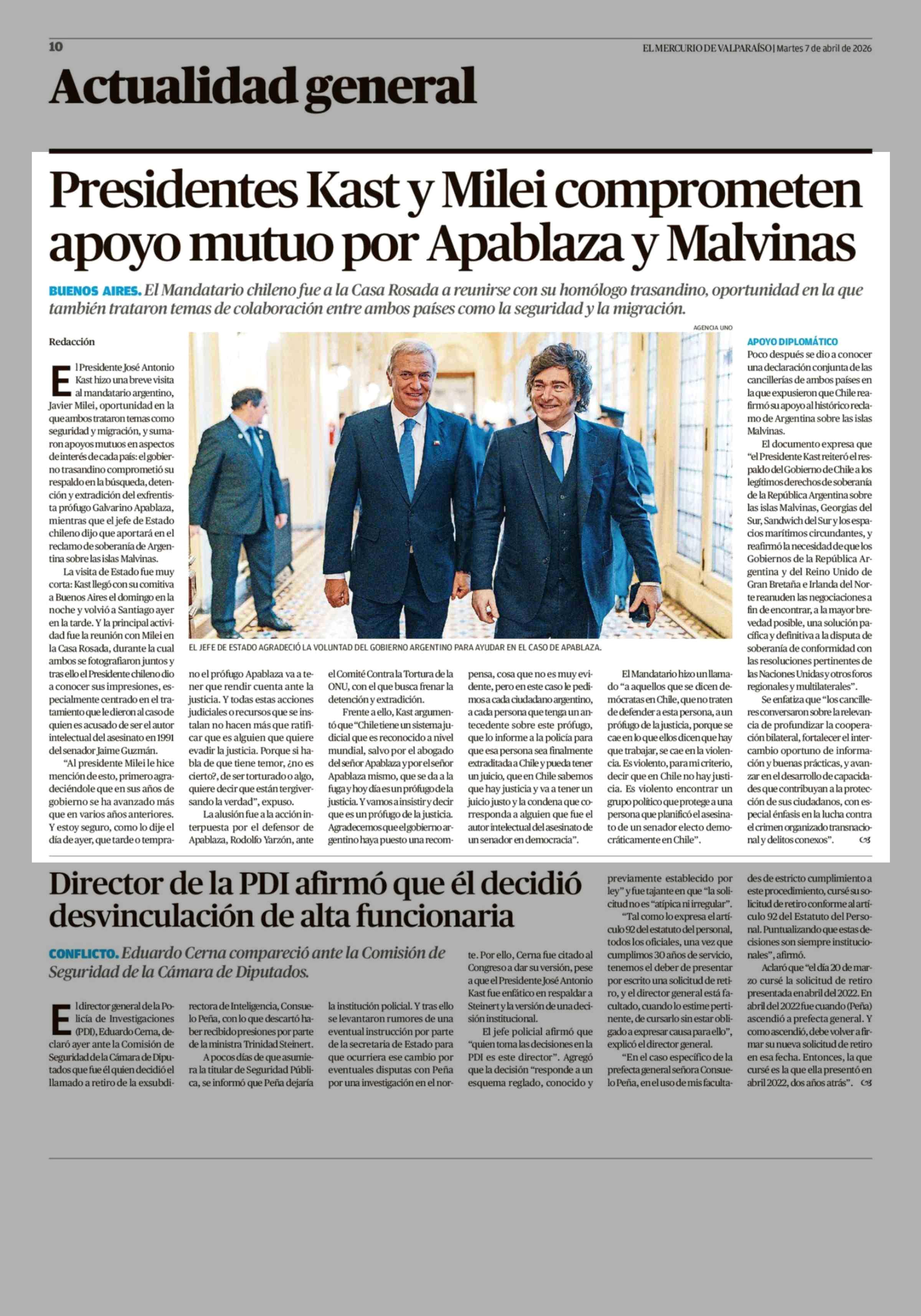Presidentes Kast y Milei comprometen apoyo mutuo por Apablaza y Malvinas 07-04-2026 El Mercurio de Valparaíso |