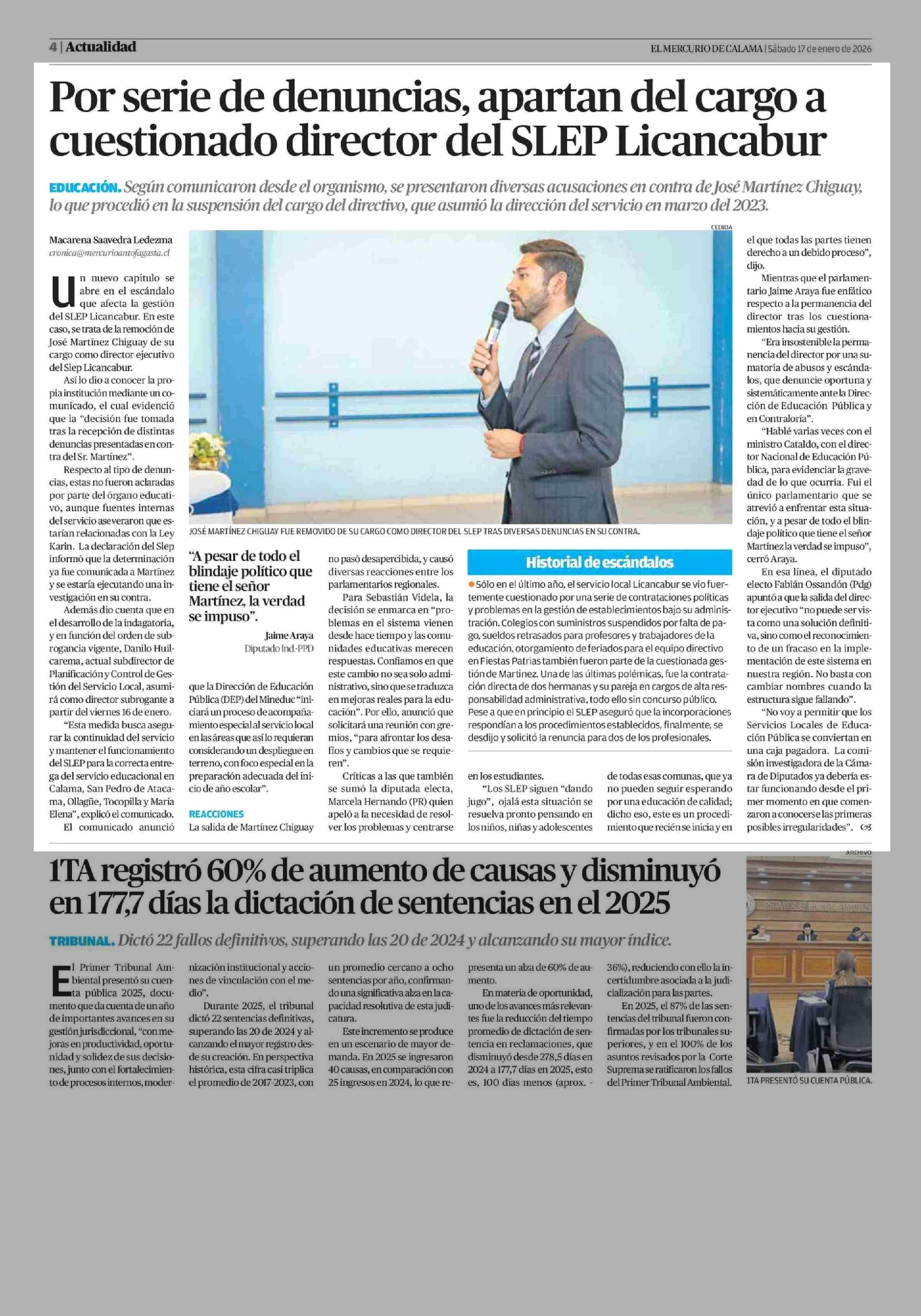 Por serie de denuncias, apartan del cargo a cuestionado director del SLEP Licancabur 17-01-2026 El Mercurio de Calama |