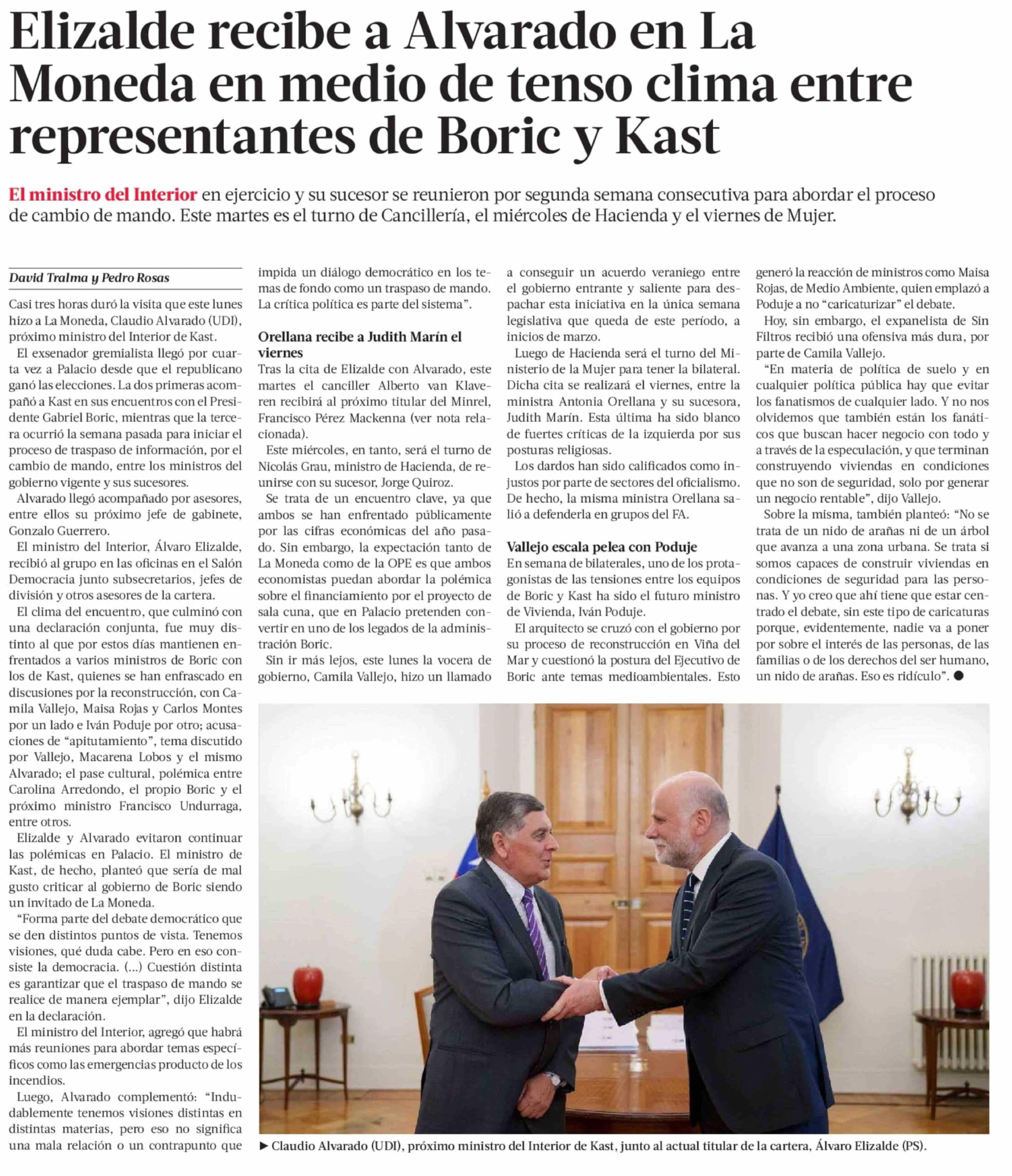 Título: Elizalde recibe a Alvarado en La Moneda en medio de tenso clima entre representantes de Boric y Kast