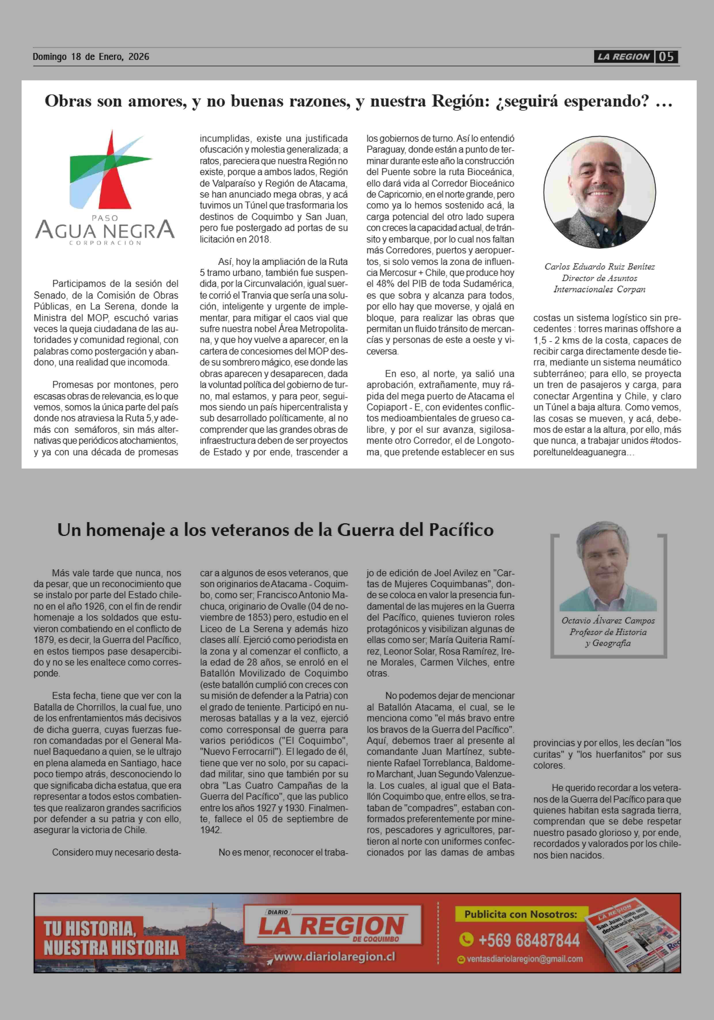Columnas de Opinión: PASO AGUA NEGRA 18-01-2026 Diario la Región |