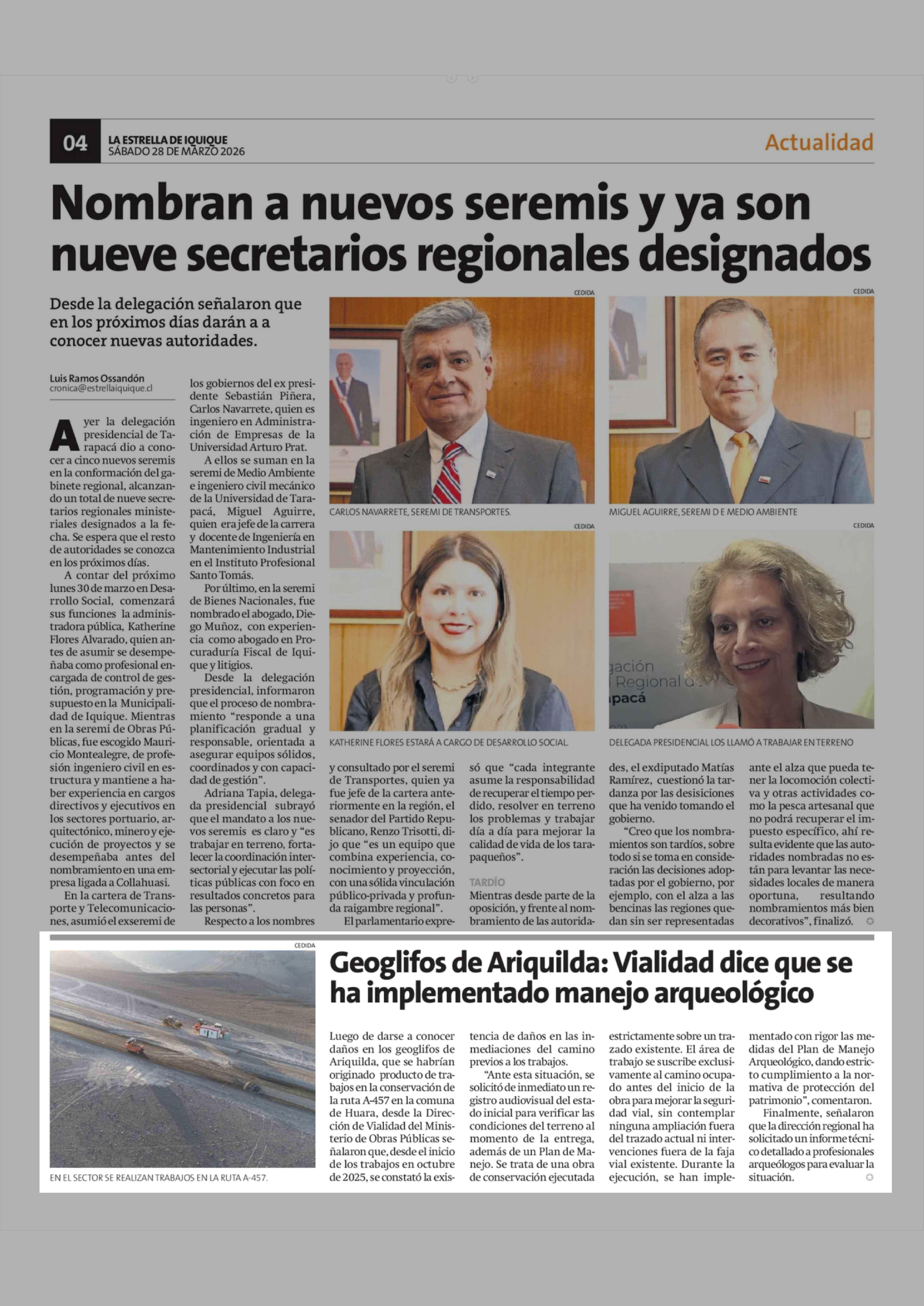 Geoglifos de Ariquilda: Vialidad dice que se ha implementado manejo arqueológico 28-03-2026 La Estrella de Iquique |