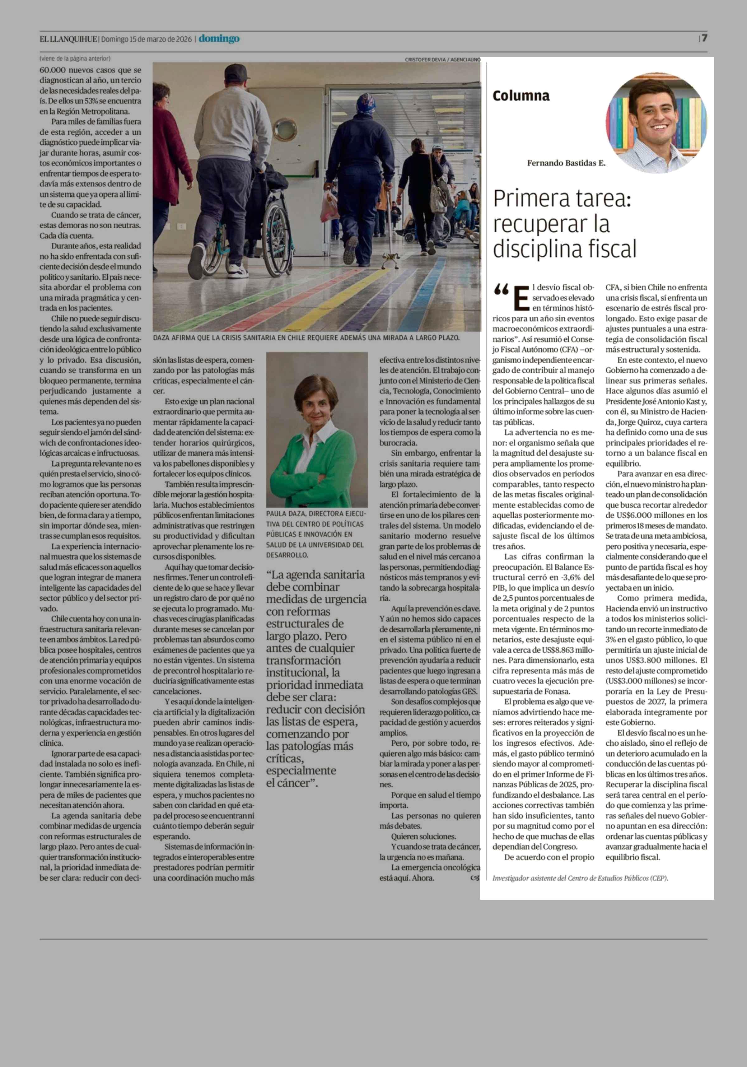 Columnas de Opinión: Primera tarea: recuperar la disciplina fiscal 15-03-2026 El Llanquihue |