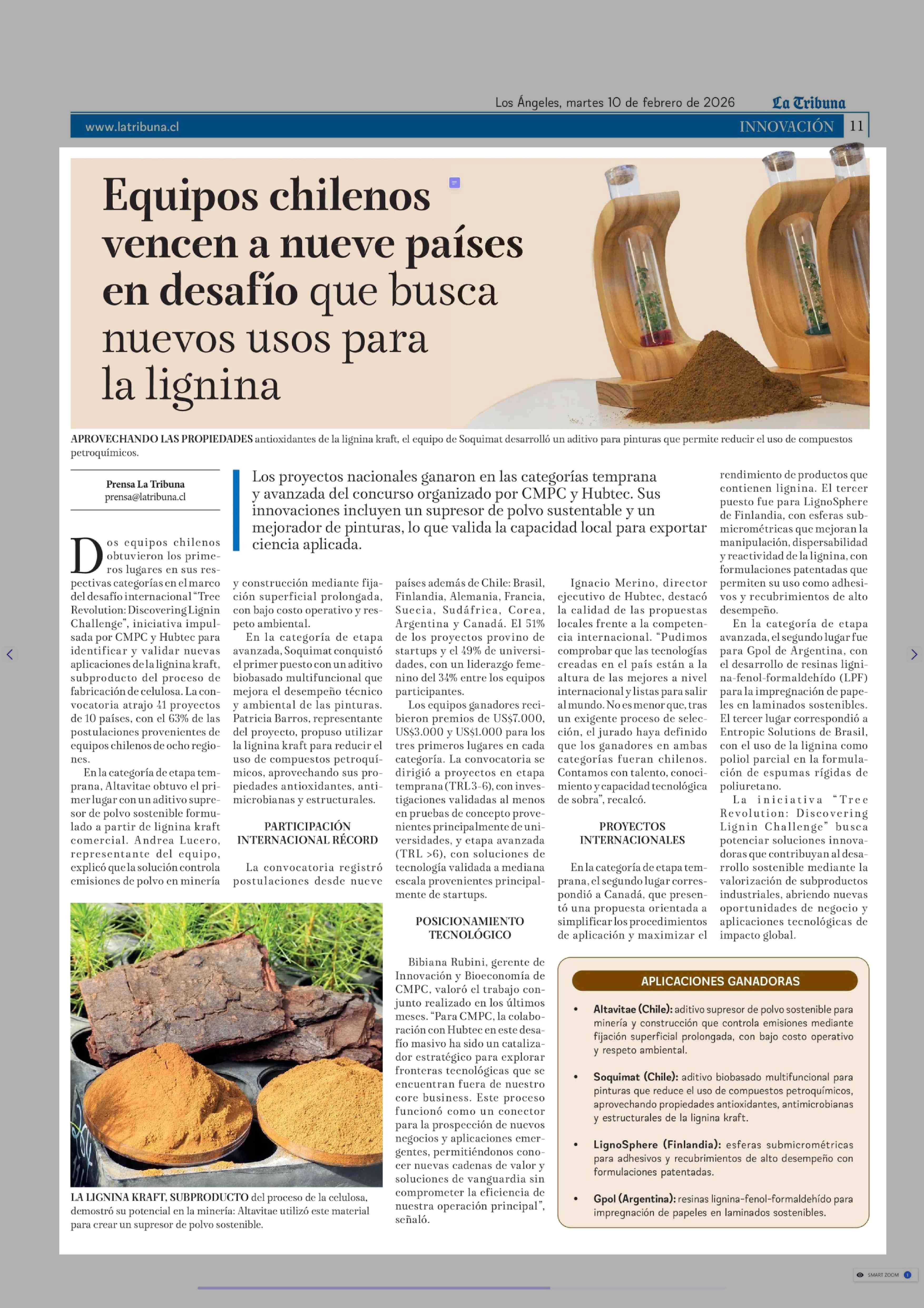 Título: Equipos chilenos vencen a nueve países en desafío que busca nuevos usos para la lignina