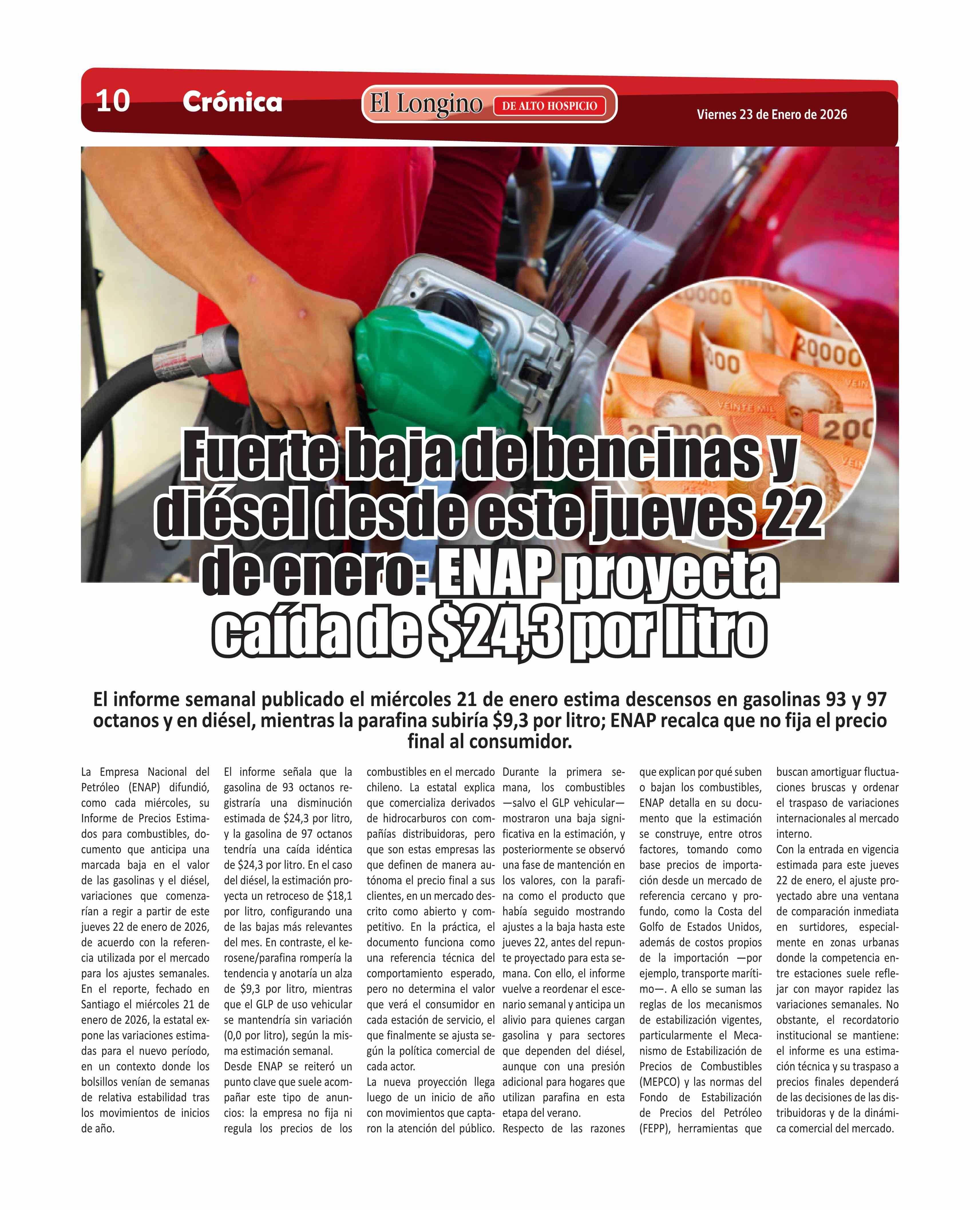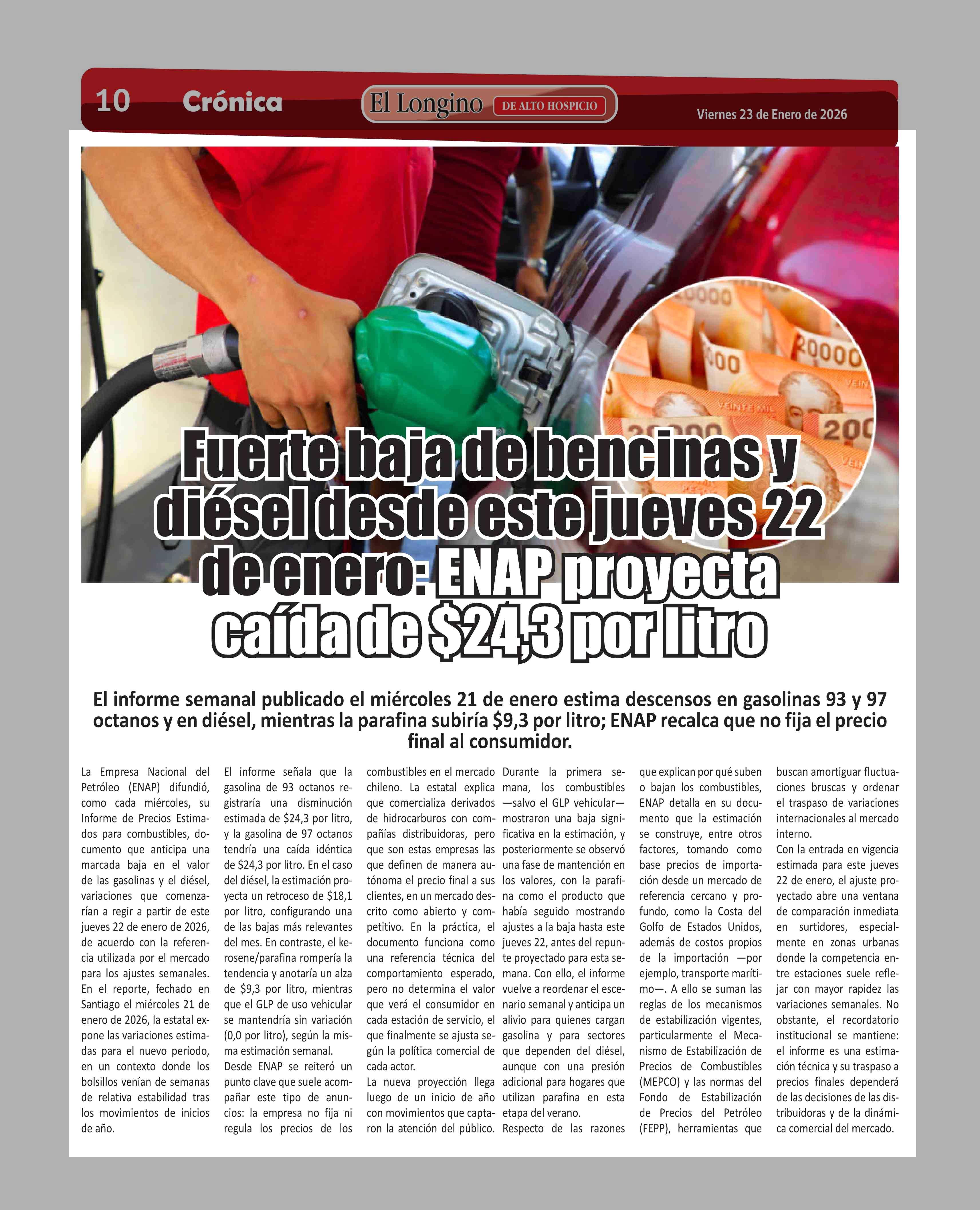 Fuerte baja de bencinas y diésel desde este jueves 22 de enero: ENAP proyecta caída de $24,3 por litro 23-01-2026 El Longino |
