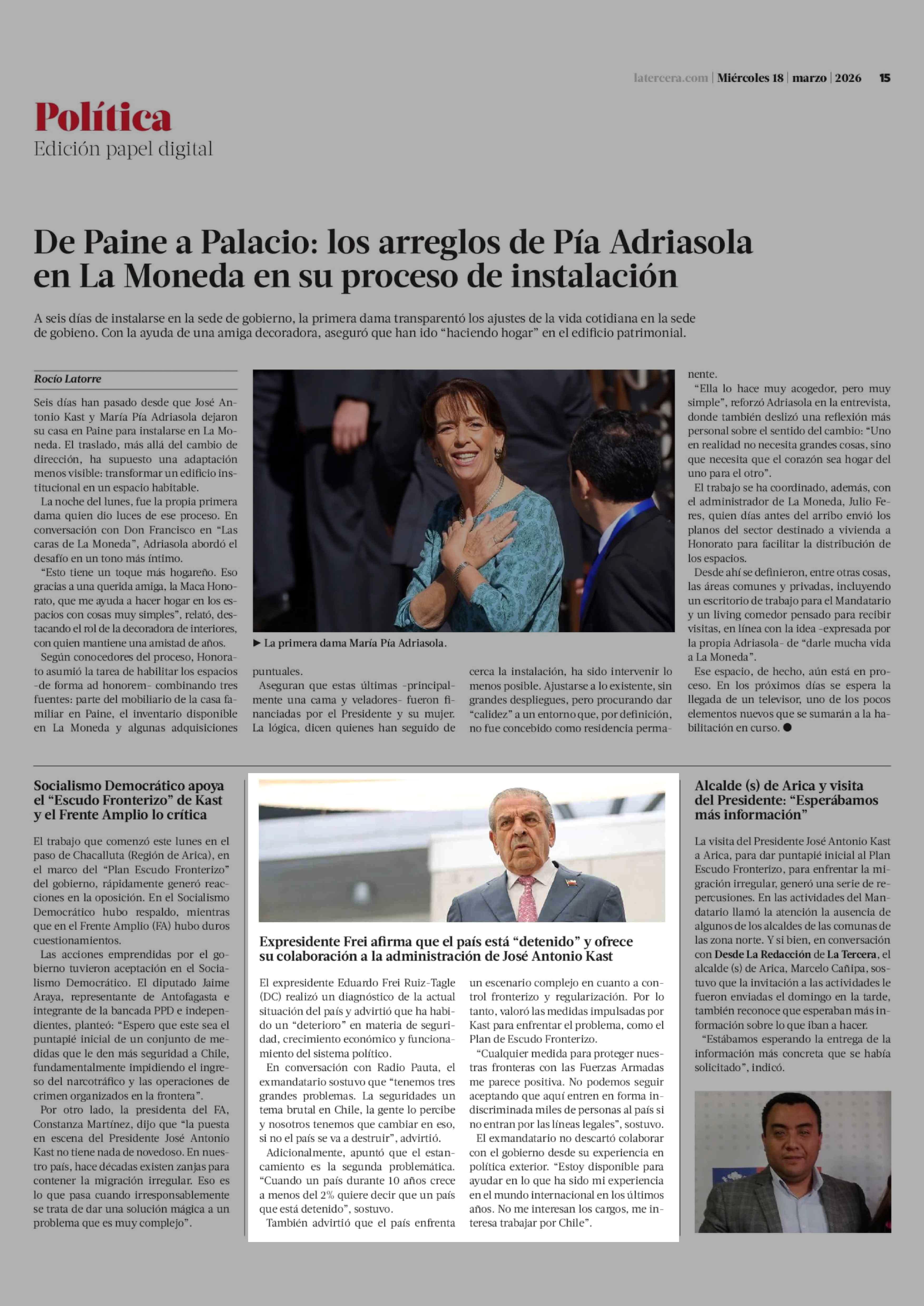 Expresidente Frei afirma que el país está "detenido" y ofrece su colaboración a la administración de José Antonio Kast 18-03-2026 La Tercera |