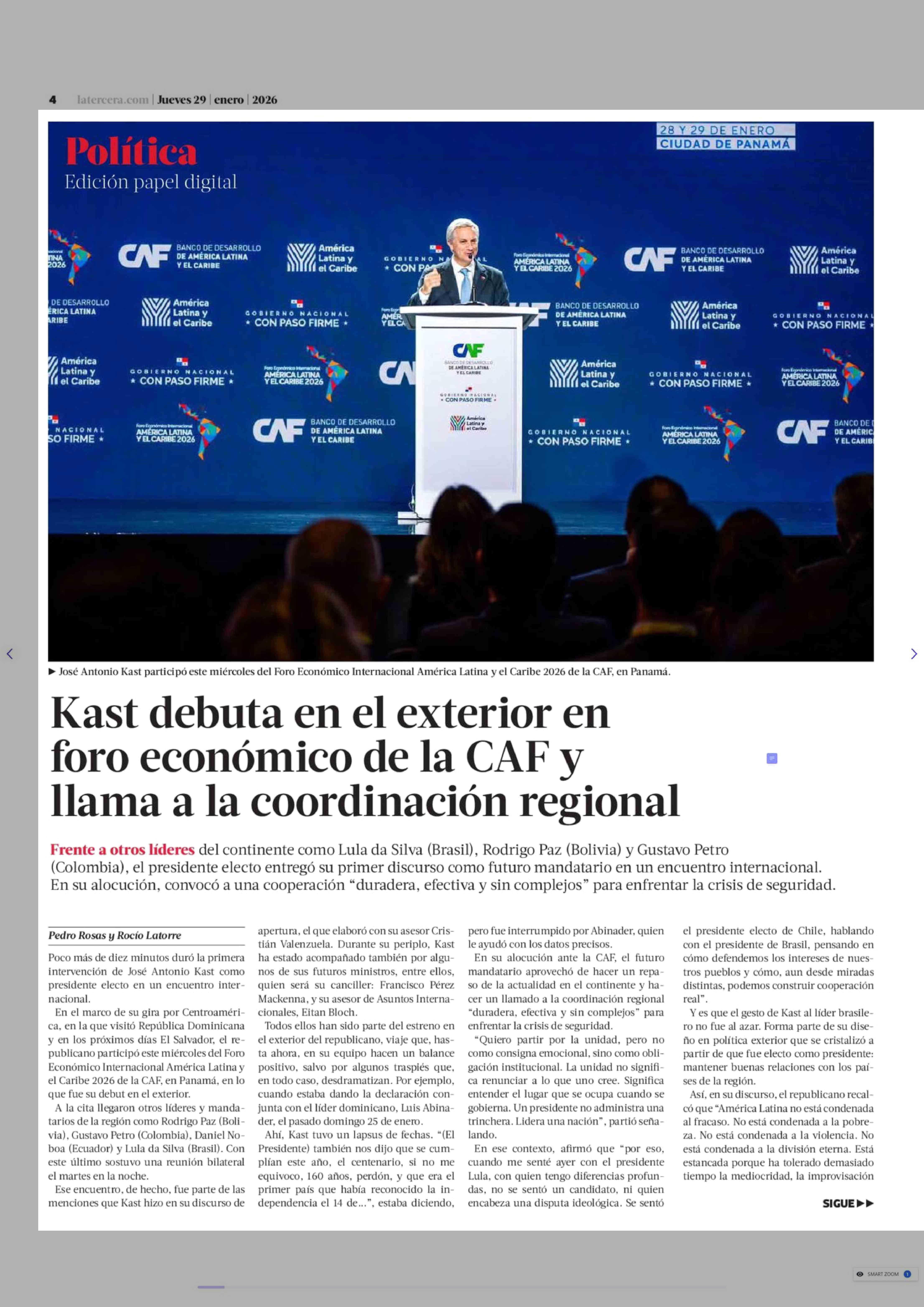Kast debuta en el exterior en foro económico de la CAF y llama a la coordinación regional 29-01-2026 La Tercera |