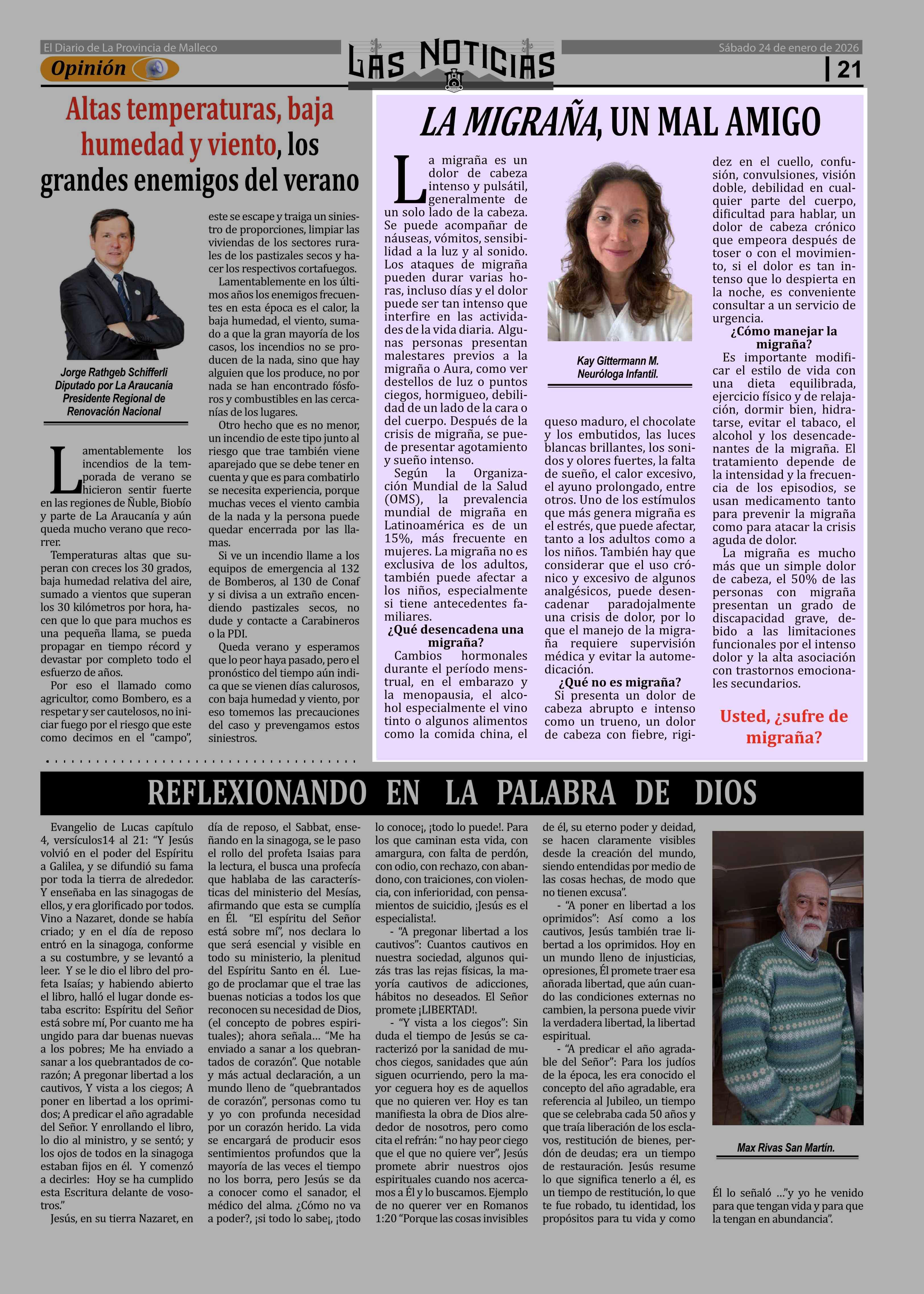 Columnas de Opinión: LA MIGRAÑA, UN MAL AMIGO 24-01-2026 Las Noticias |