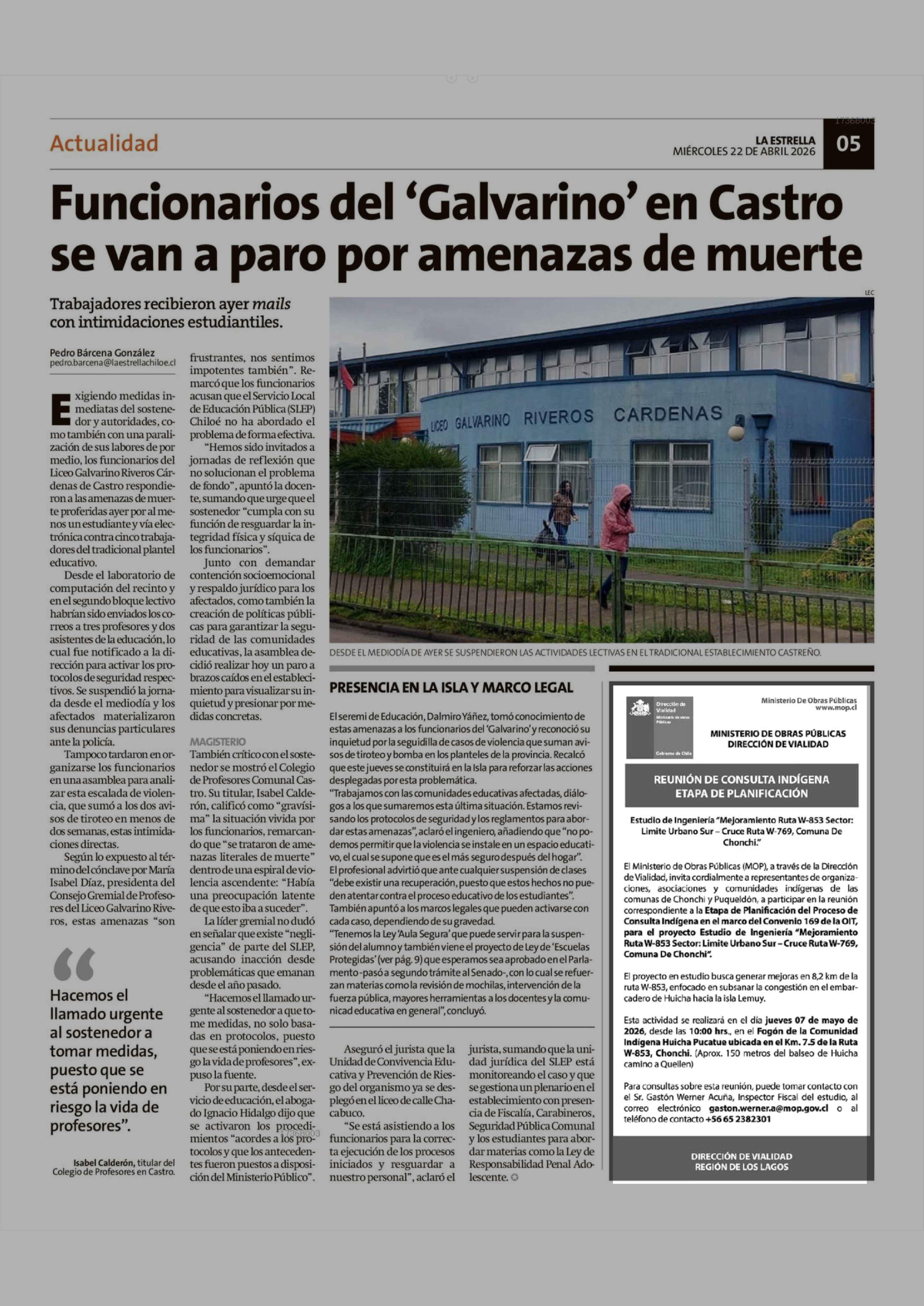 Extractos: Ministerio De Obras Públicas www.mop.cl 22-04-2026 La Estrella de Chiloé |