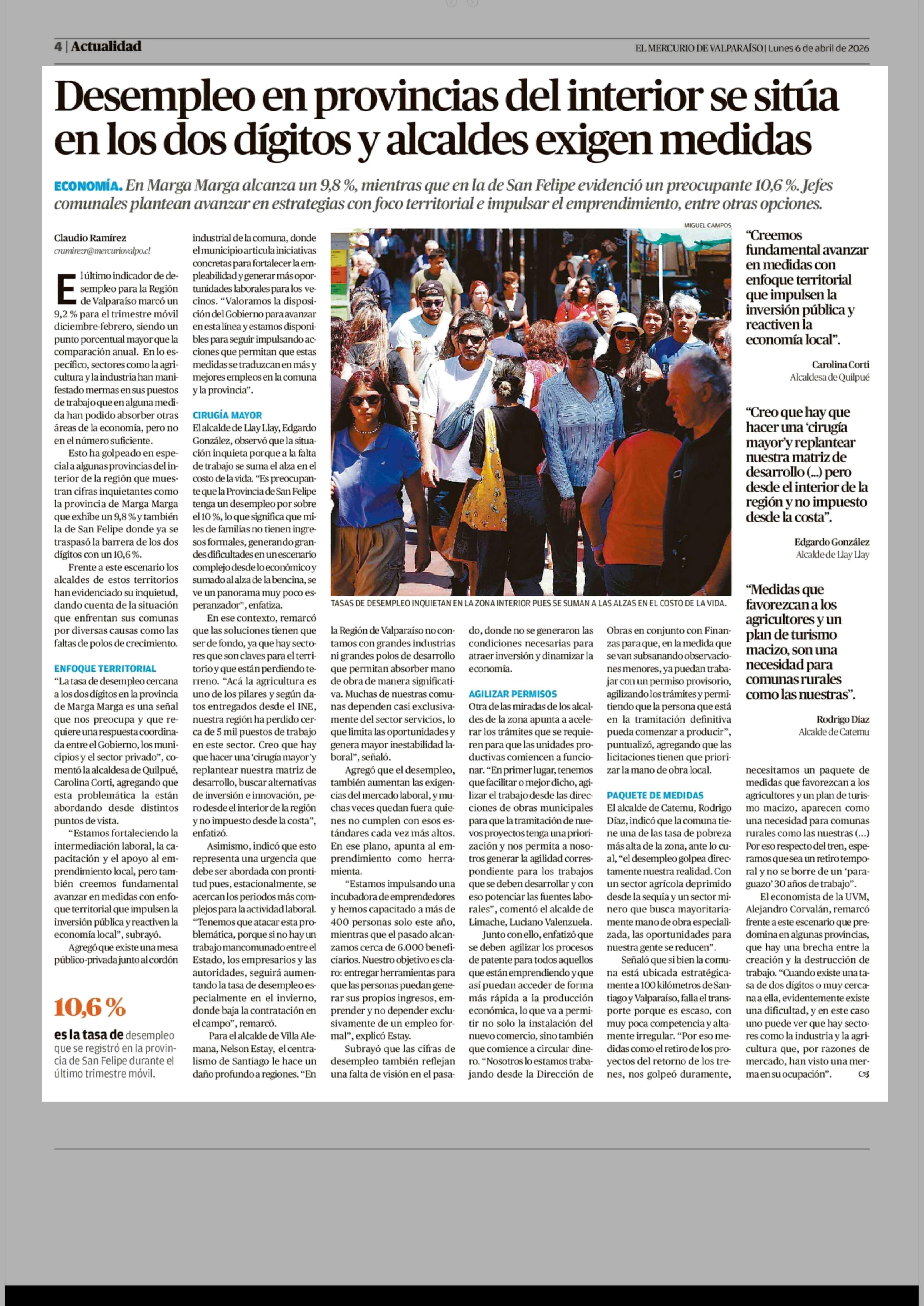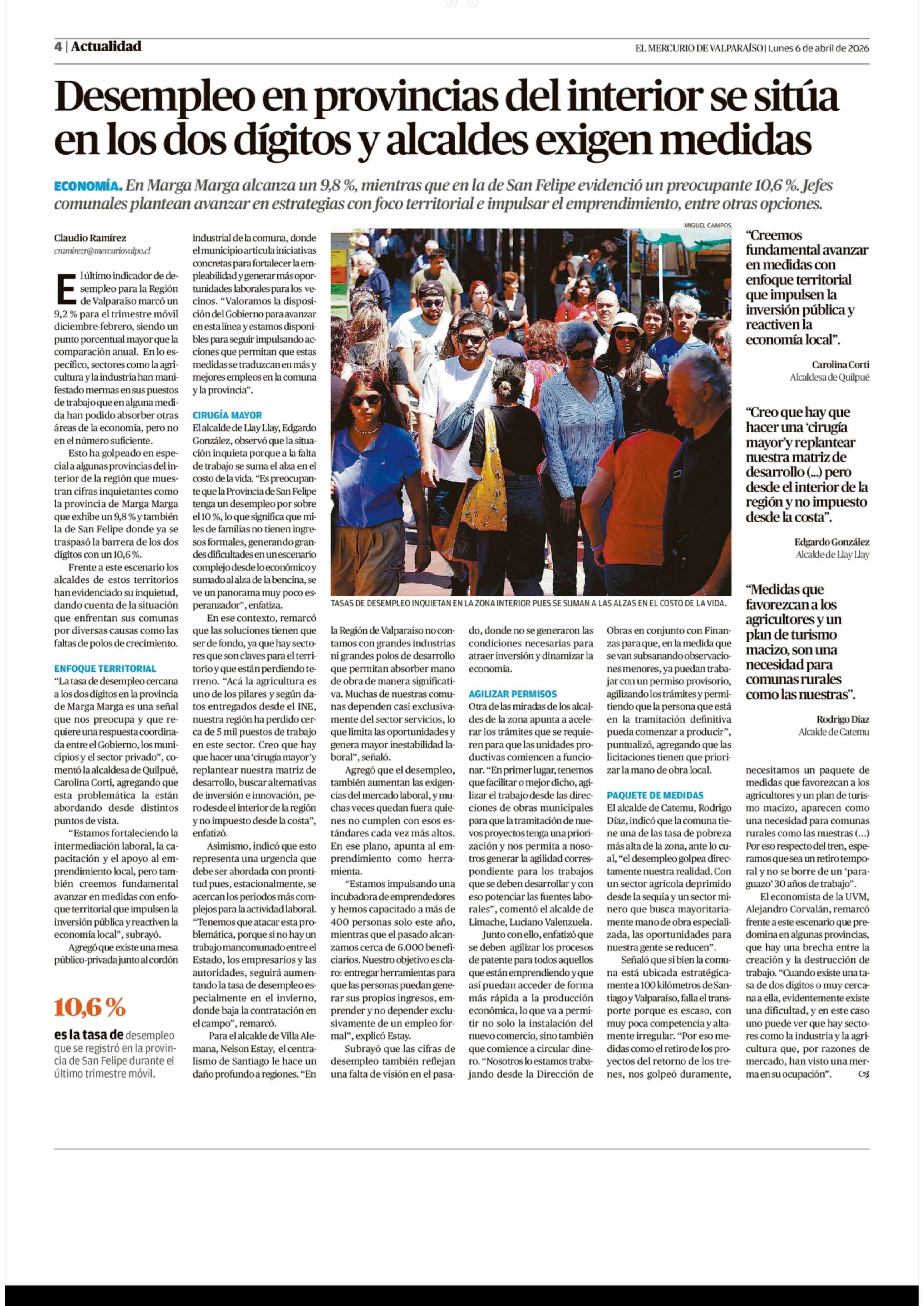 Desempleo en provincias del interior se sitúa en los dos dígitos y alcaldes exigen medidas 06-04-2026 El Mercurio de Valparaíso |