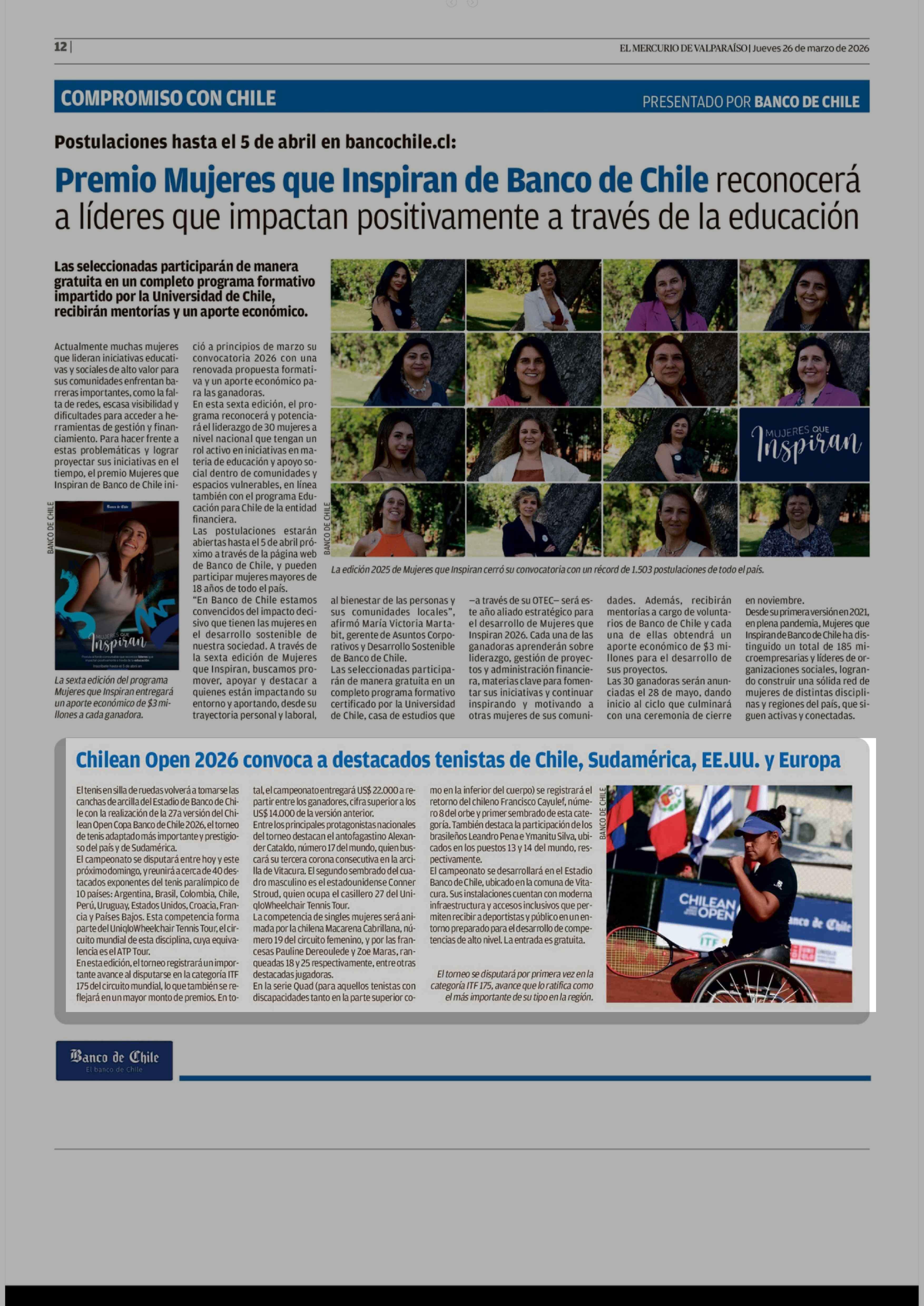 Chilean Open 2026 convoca a destacados tenistas de Chile, Sudamérica, EE.UU. y Europa 26-03-2026 El Mercurio de Valparaíso |
