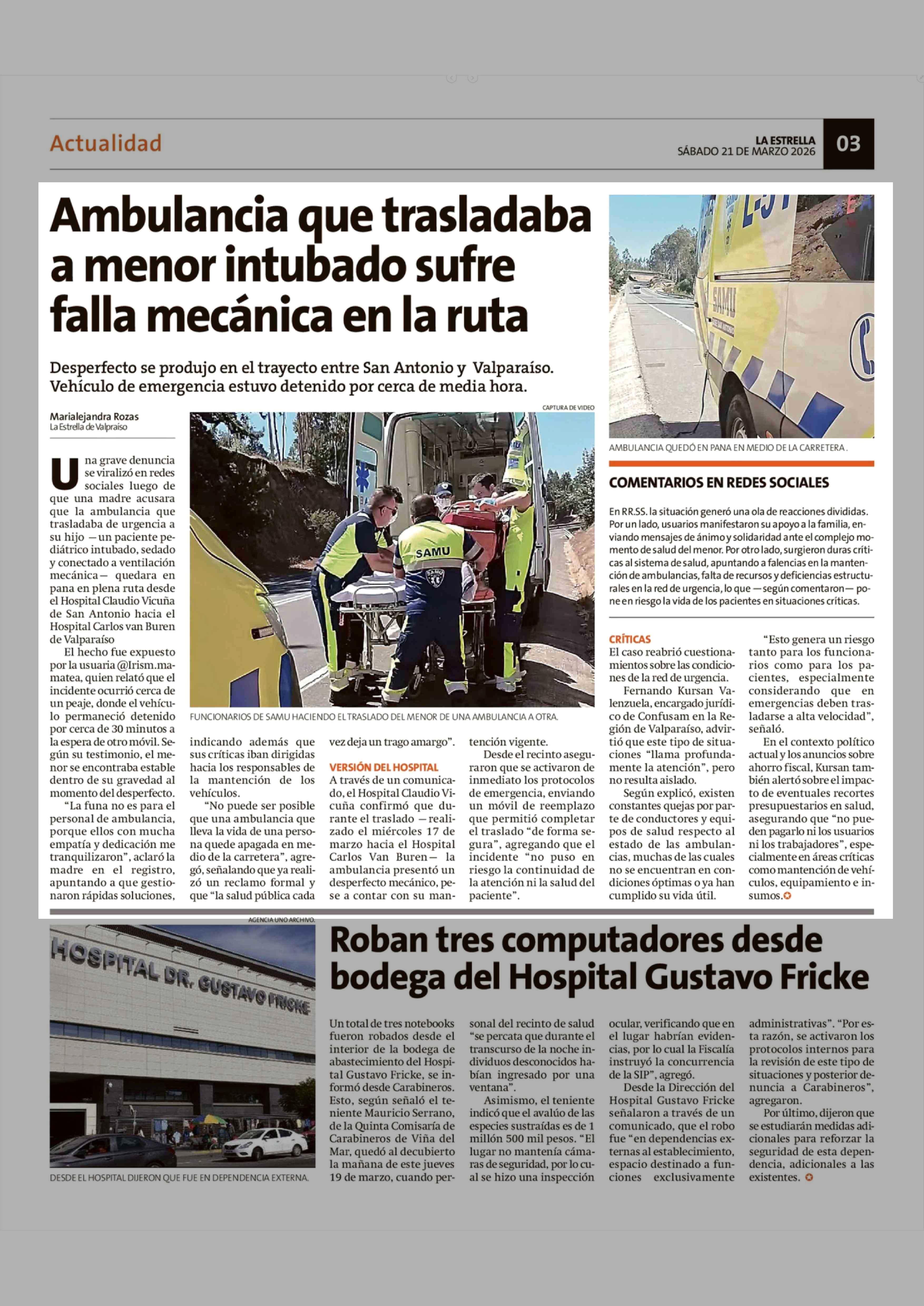 Ambulancia que trasladaba a menor intubado sufre falla mecánica en la ruta 21-03-2026 La Estrella de Valparaíso |