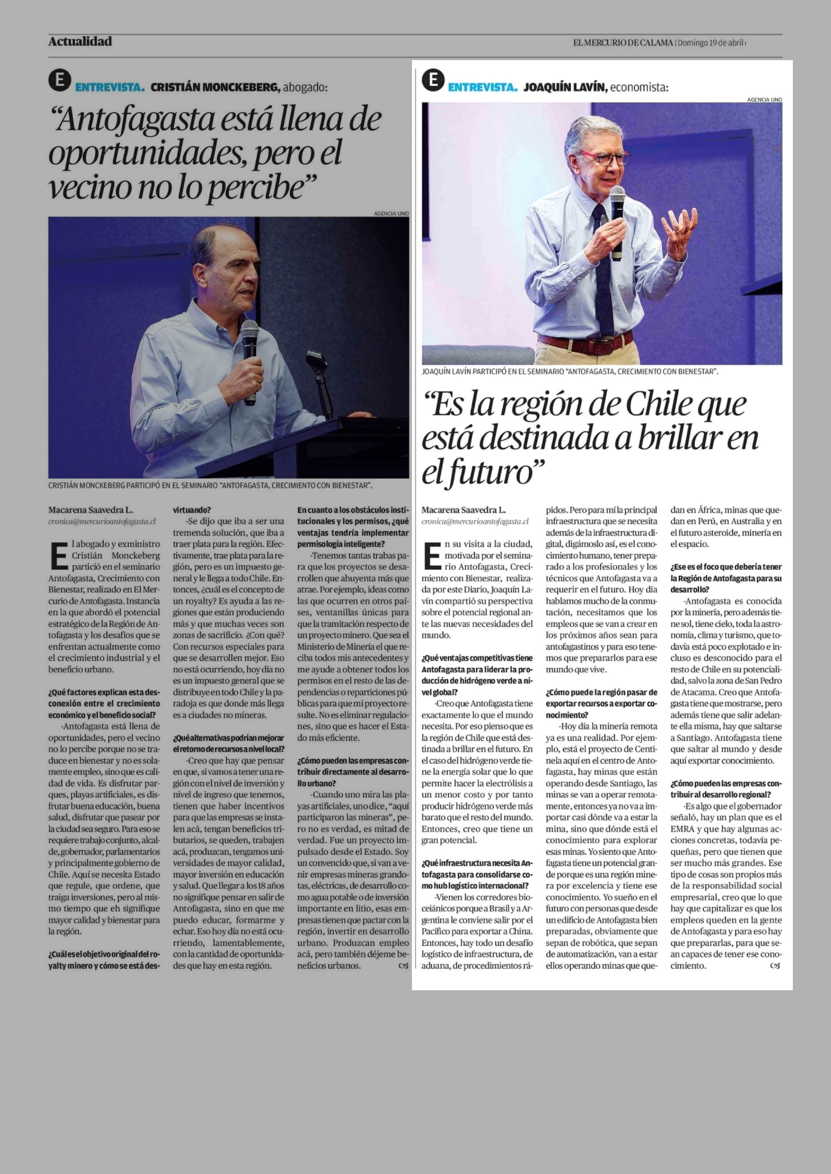 "Es la región de Chile que está destinada a brillar en el futuro" 19-04-2026 El Mercurio de Calama |