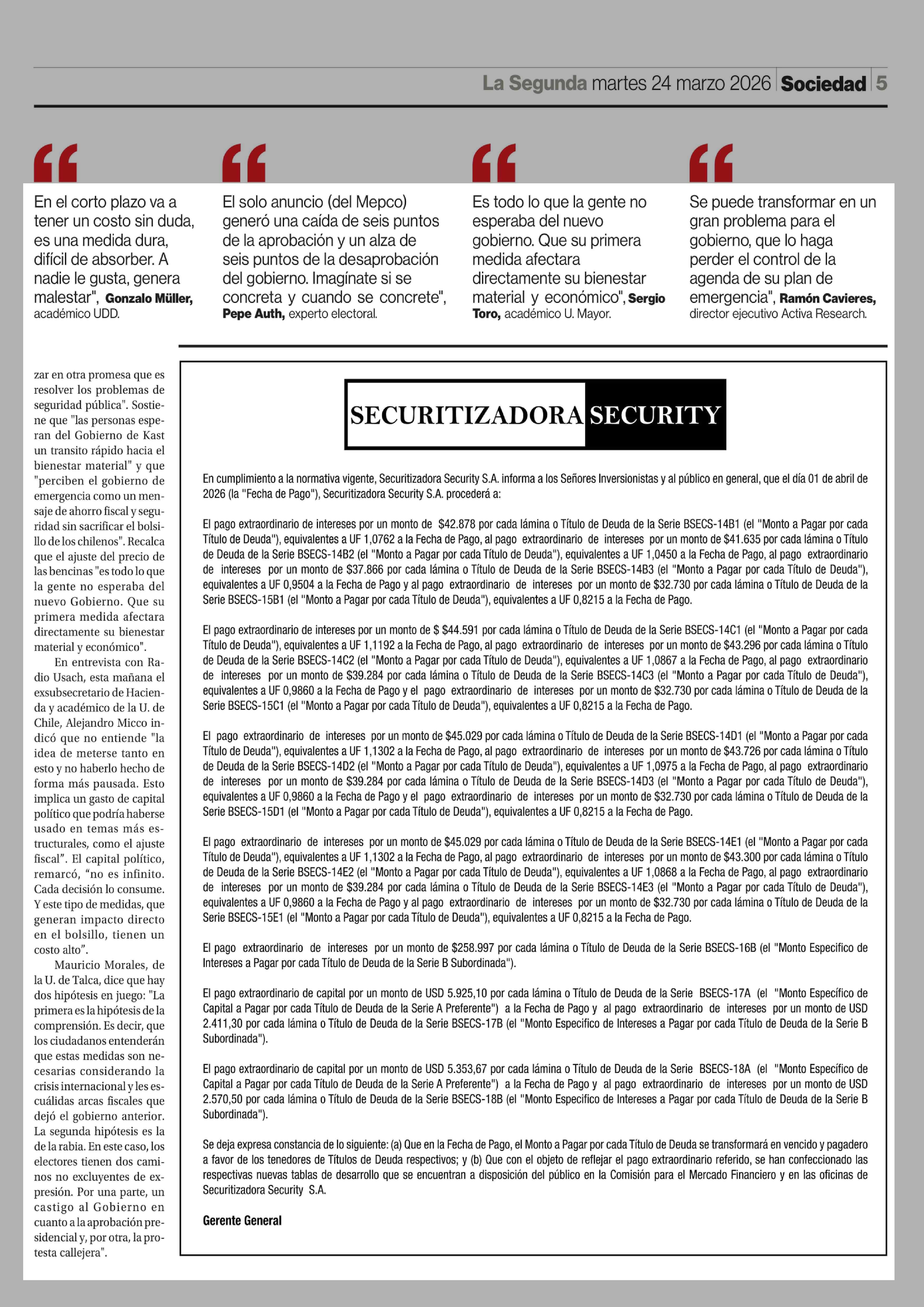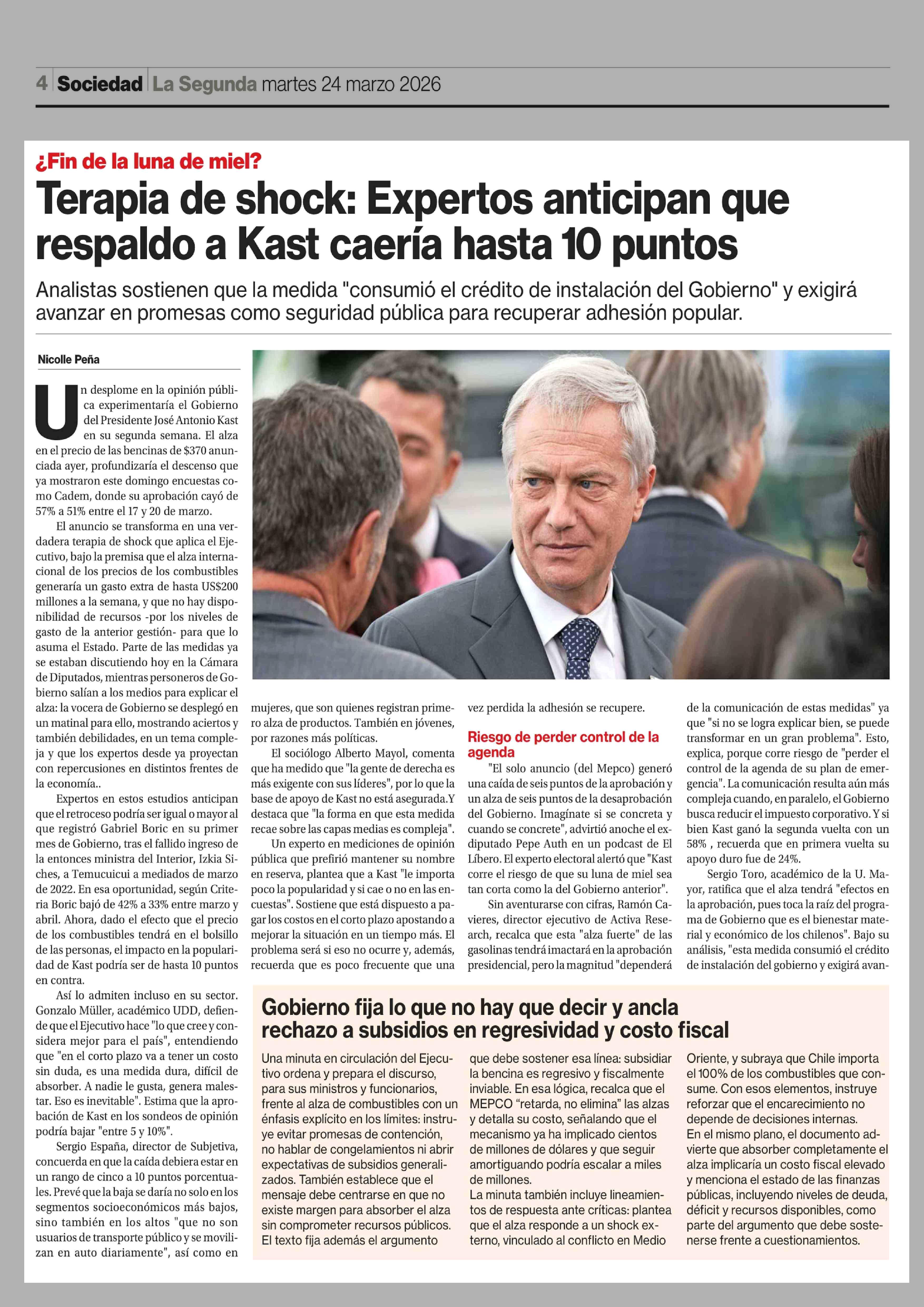 Terapia de shock: Expertos anticipan que respaldo a Kast caería hasta 10 puntos 24-03-2026 La Segunda |