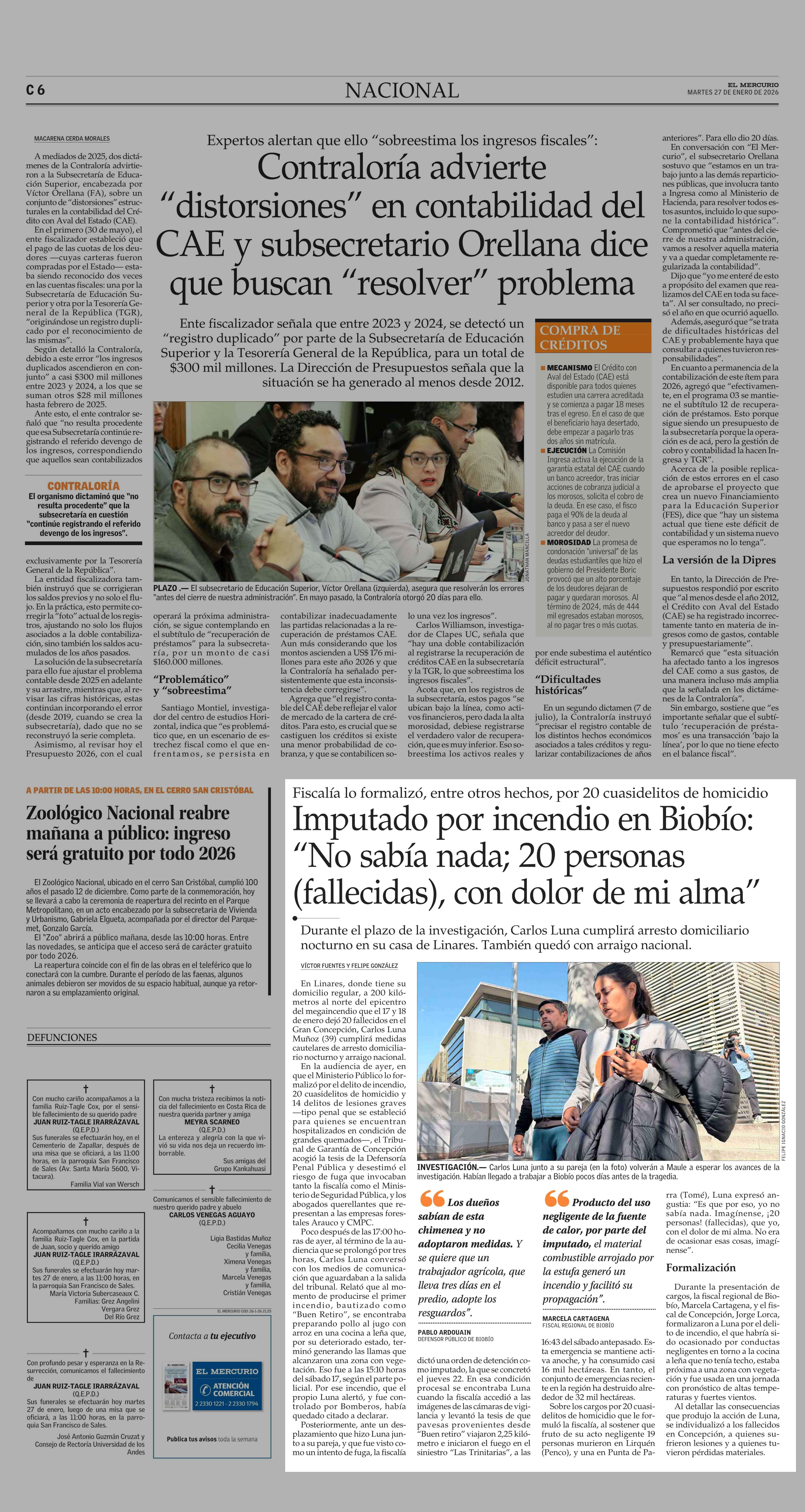 Imputado por incendio en Biobío: “No sabía nada; 20 personas (fallecidas), con dolor de mi alma” 27-01-2026 El Mercurio |
