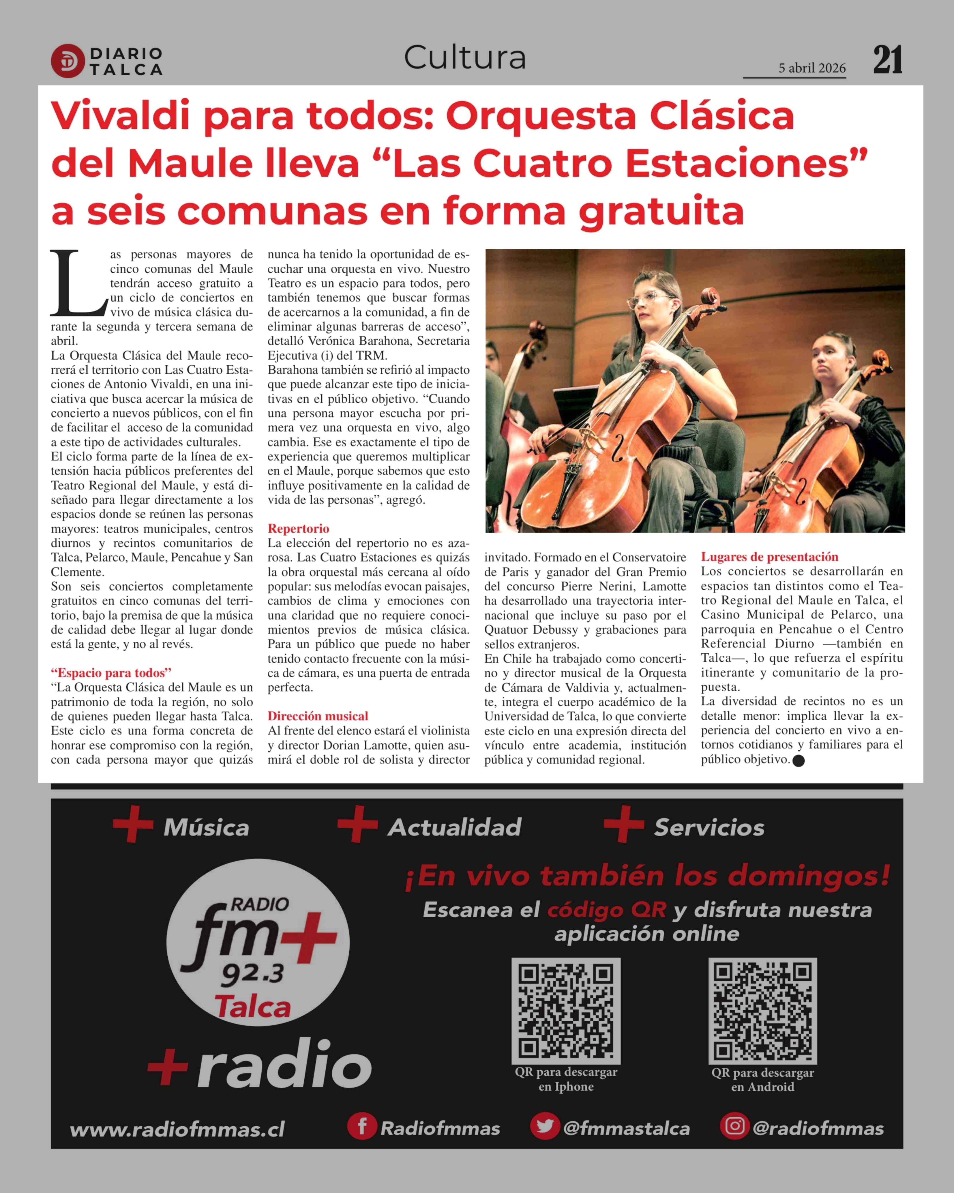 Vivaldi para todos: Orquesta Clásica del Maule lleva "Las Cuatro Estaciones" a seis comunas en forma gratuita 05-04-2026 Diario Talca |