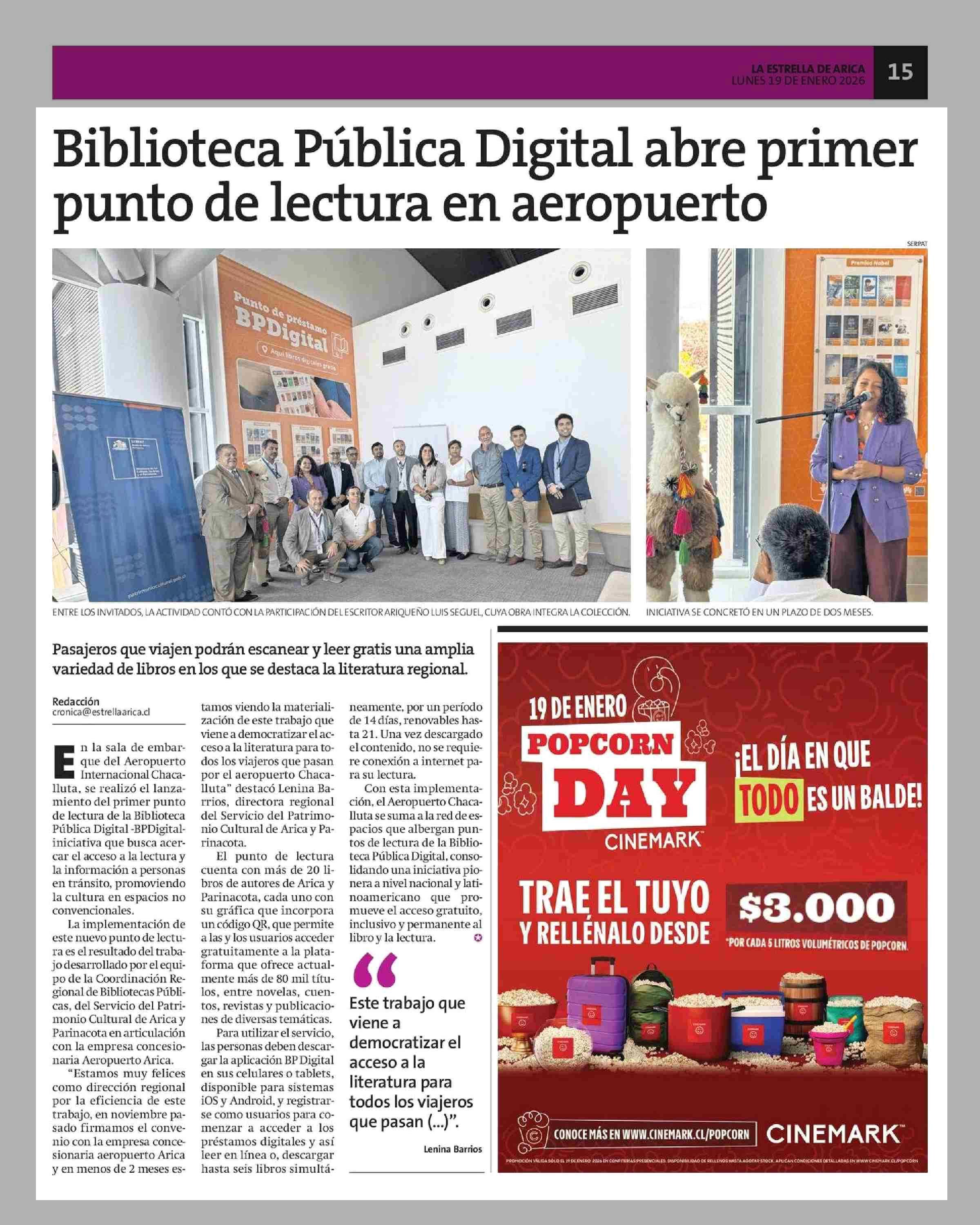 Biblioteca Pública Digital abre primer punto de lectura en aeropuerto 19-01-2026 La Estrella de Arica |