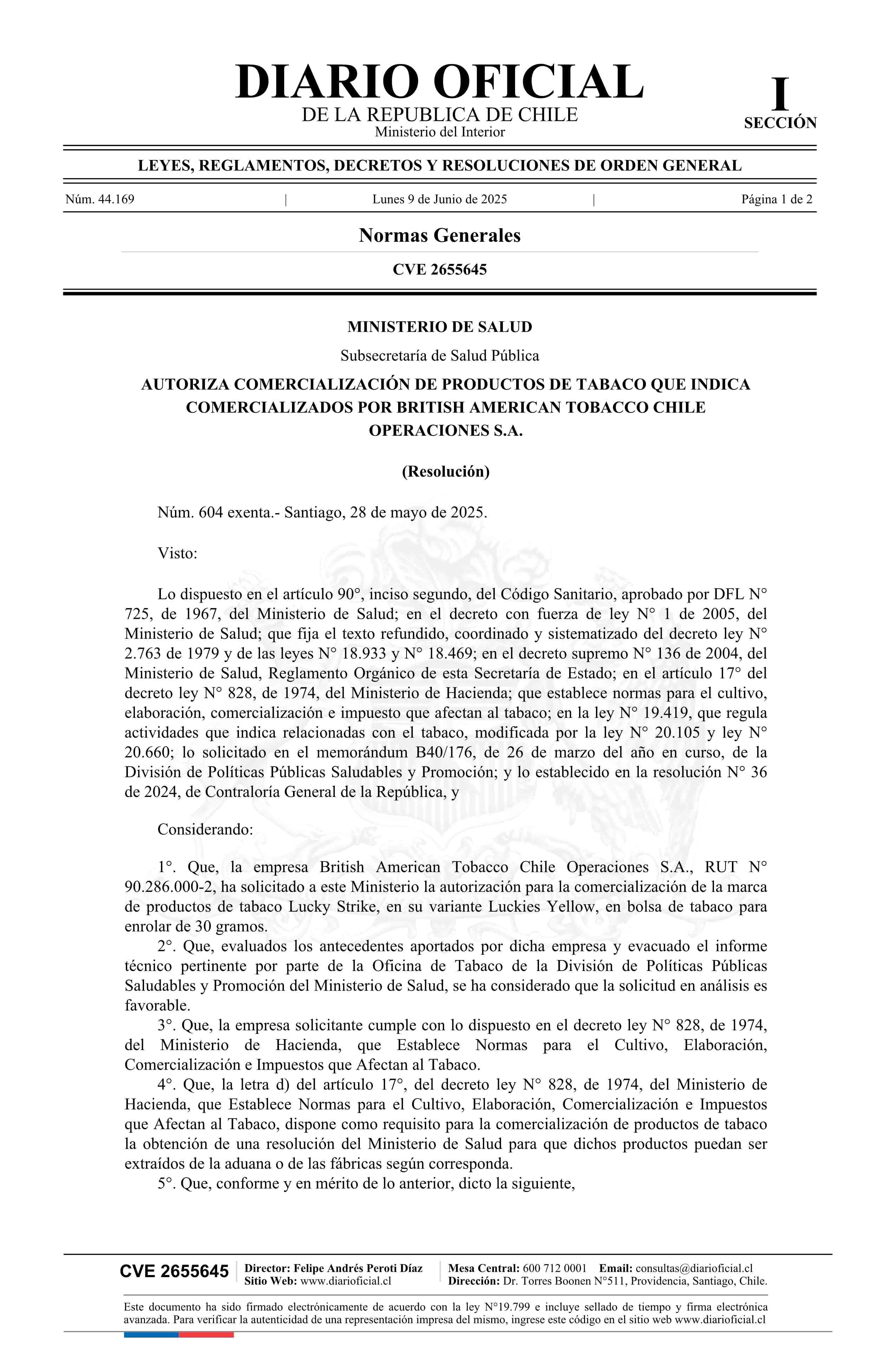 Resolución exenta número 604, de 2025.- Autoriza comercialización de productos de tabaco que indica comercializados por British American Tobacco Chile Operaciones S.A. 09-06-2025 DIARIO OFICIAL CHILE - BOLETÍN OFICIAL DE MINERÍA |